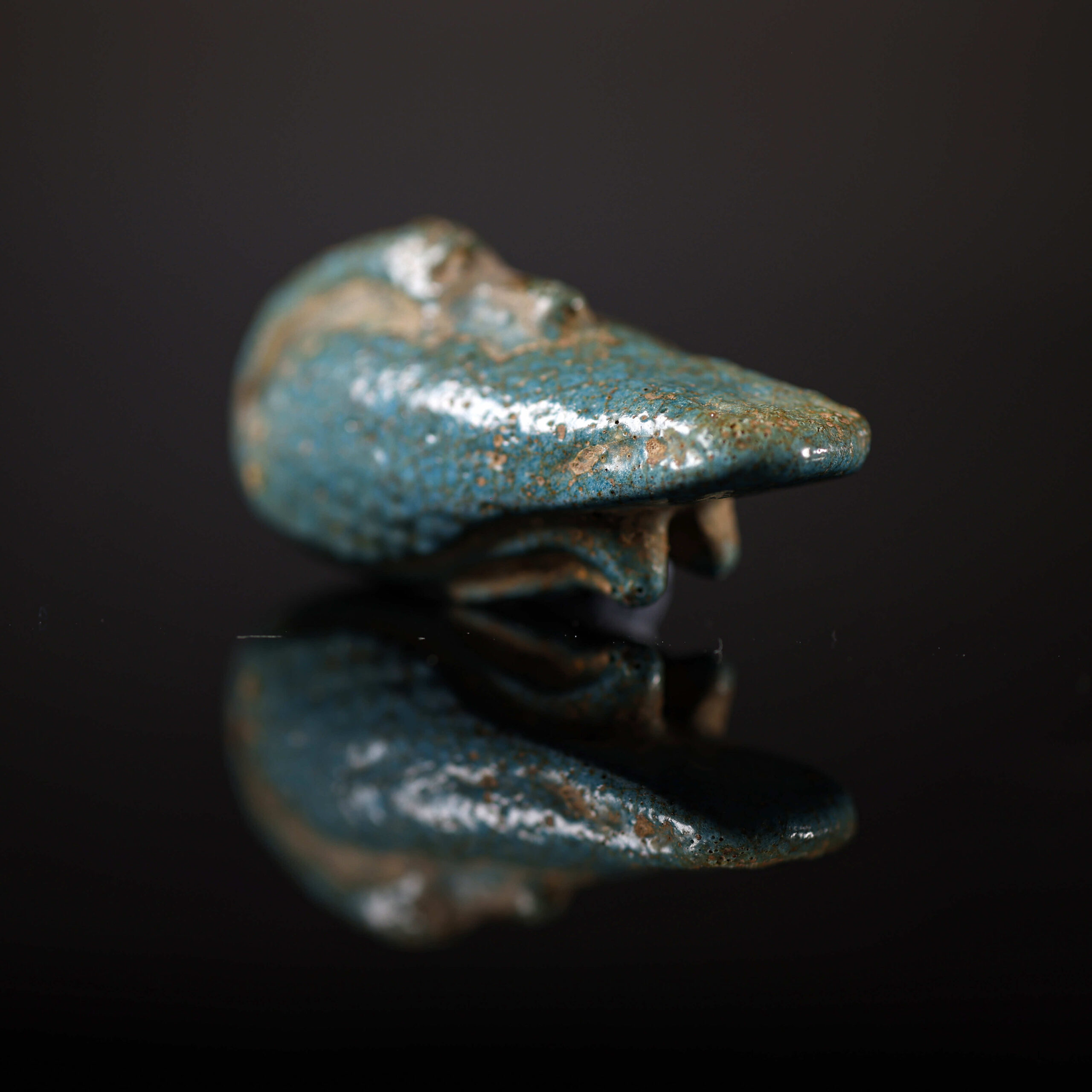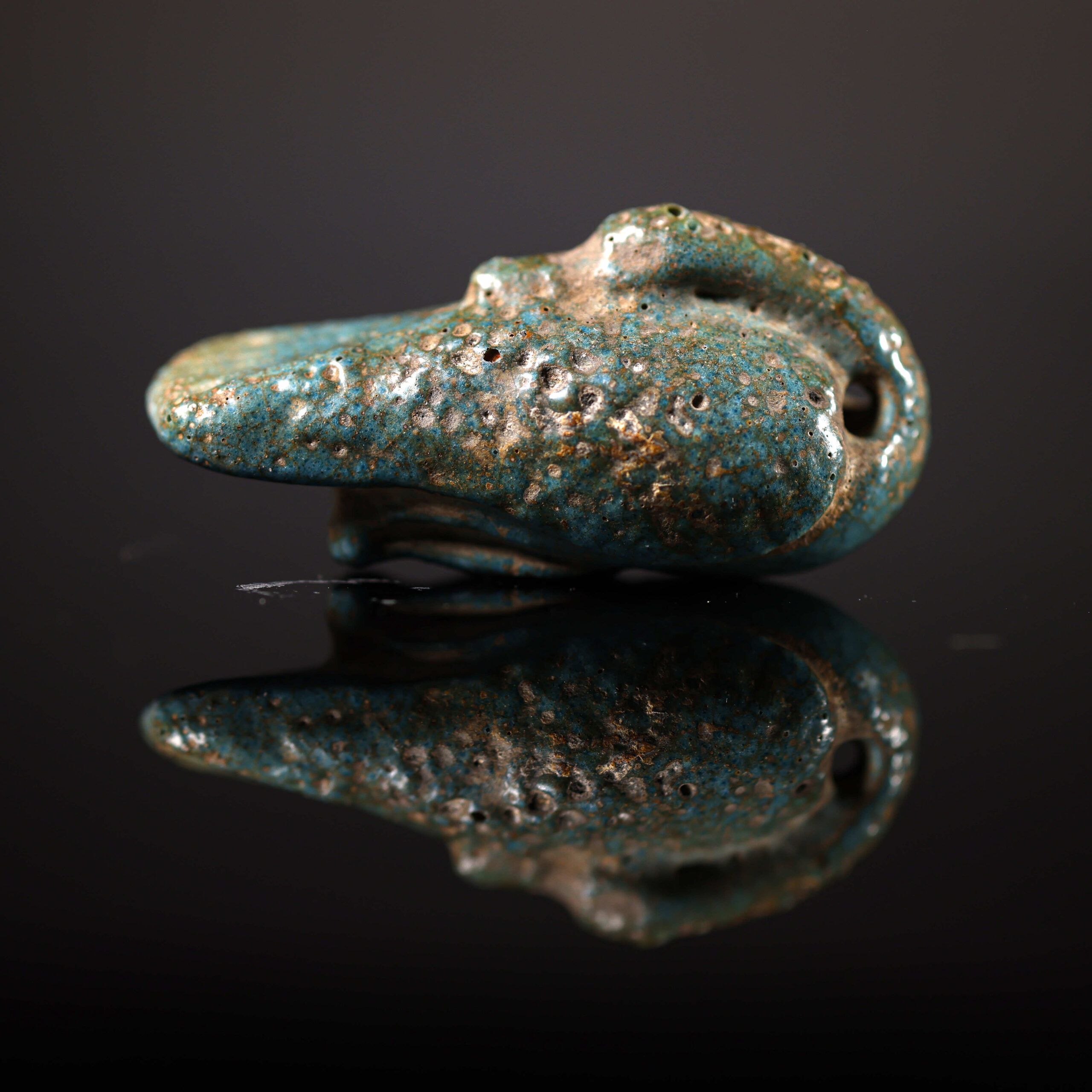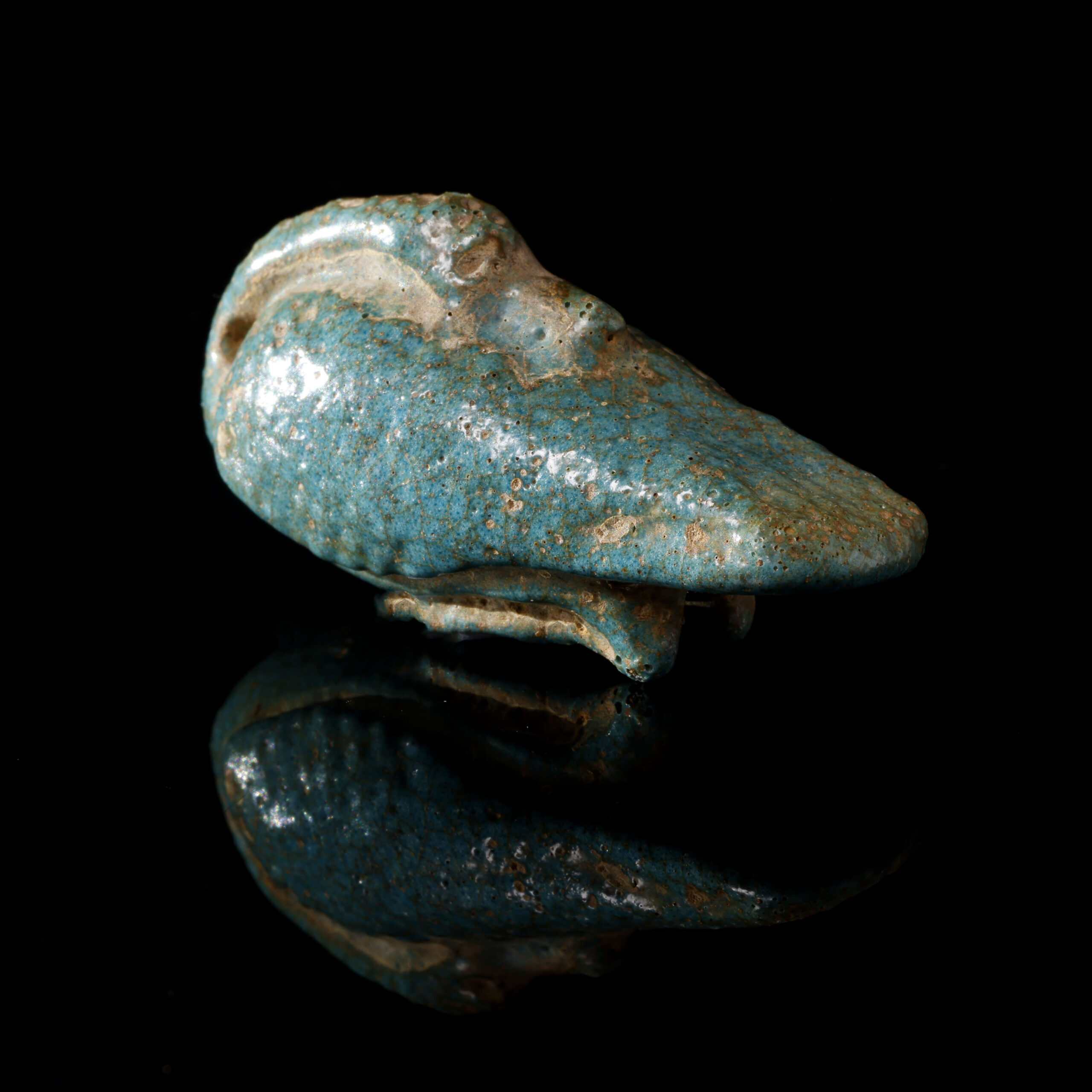 El amuleto de oca es una pieza del Antiguo Egipto que data de la Baja Época (722-332 a.C.). realizado en fayenza, mide 2 cm de alto, 1,5 cm de ancho y 4,5 cm de largo. La oca era un animal simbólico en la cultura egipcia, asociado con el dios Geb, deidad de la tierra y la fertilidad. Este tipo de amuletos se utilizaba para representar la abundancia y la fertilidad, buscando protección y prosperidad. La pieza se encuentra en excelente estado de conservación.