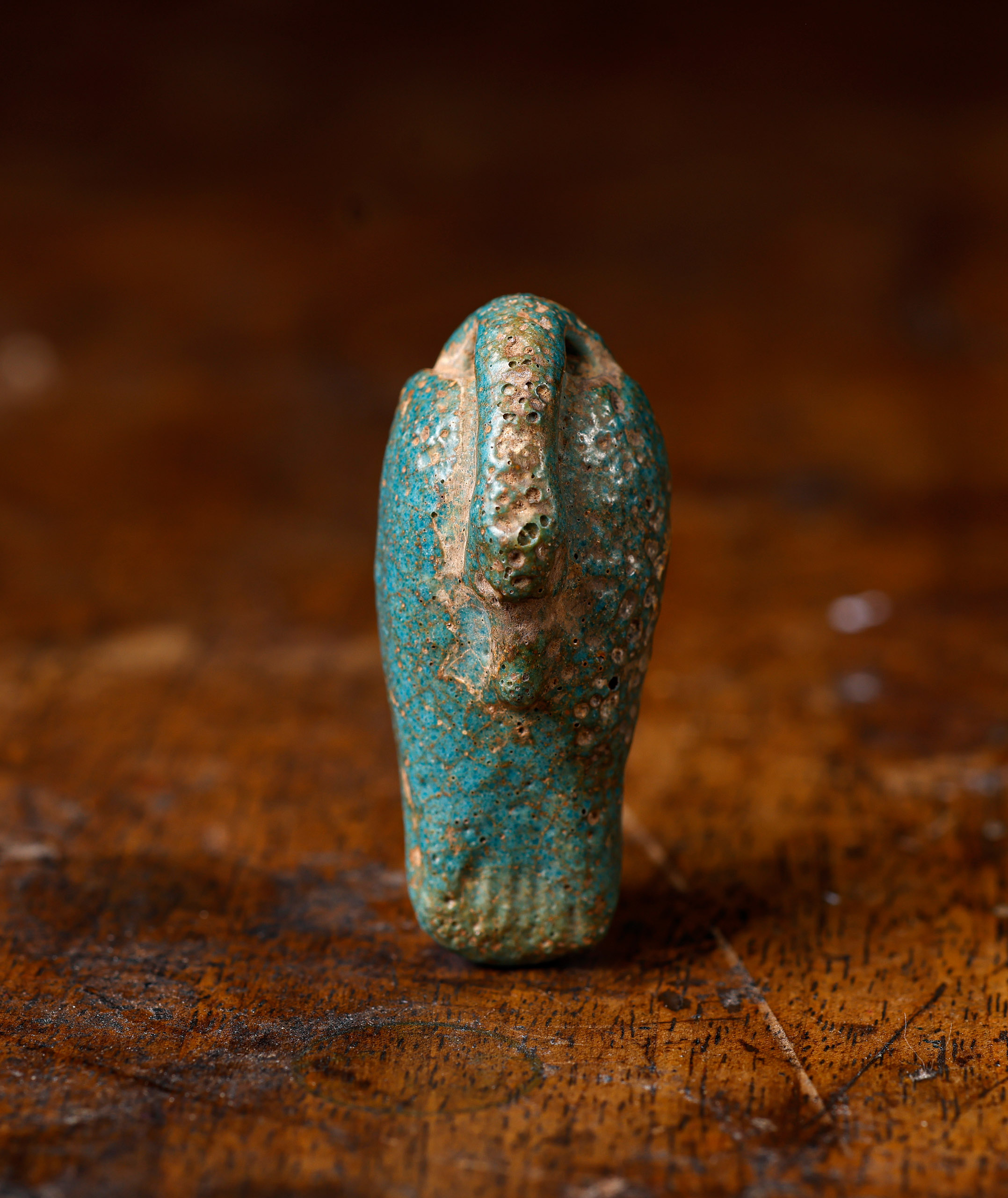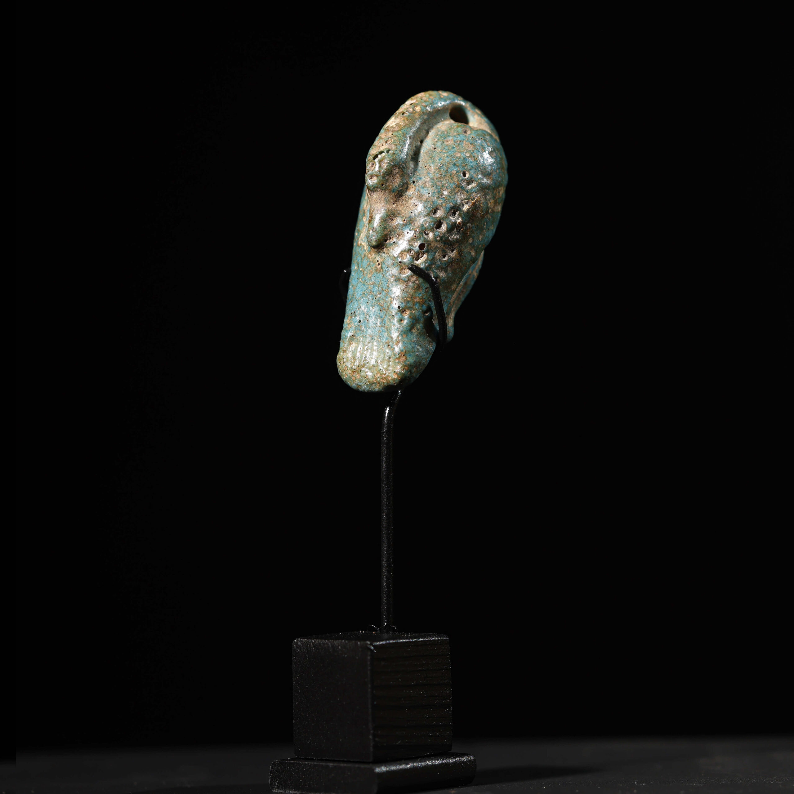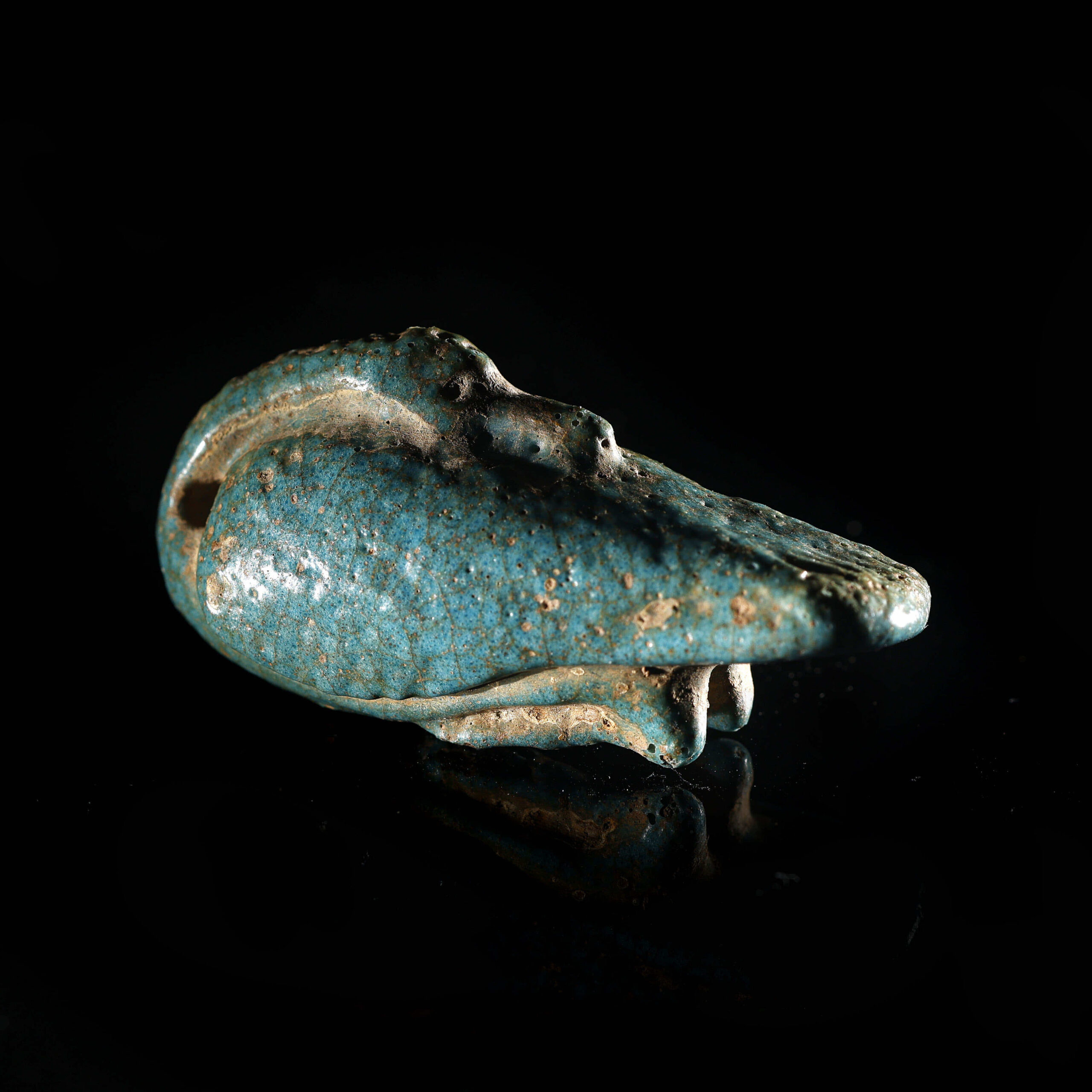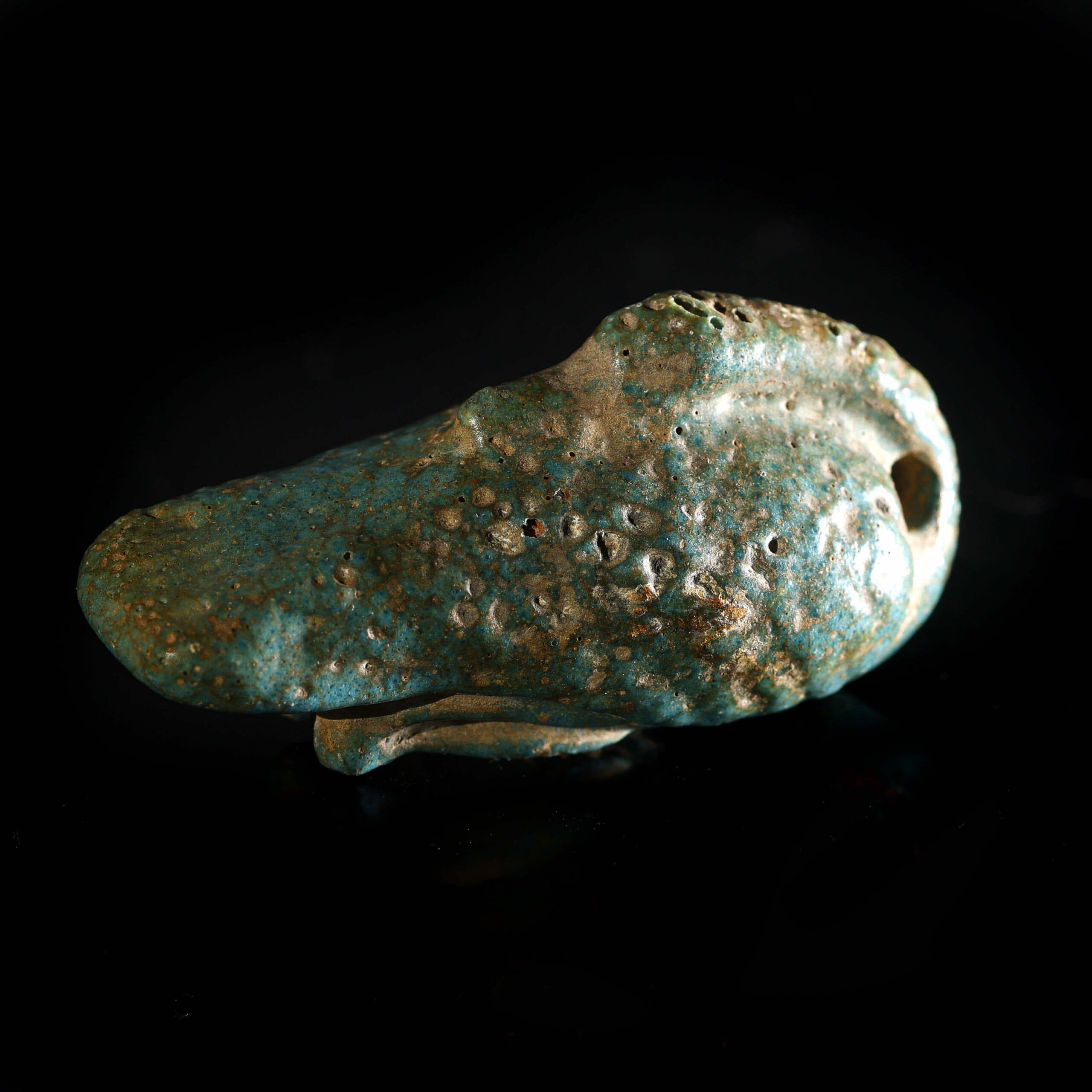 El amuleto de oca es una pieza del Antiguo Egipto que data de la Baja Época (722-332 a.C.). realizado en fayenza, mide 2 cm de alto, 1,5 cm de ancho y 4,5 cm de largo. La oca era un animal simbólico en la cultura egipcia, asociado con el dios Geb, deidad de la tierra y la fertilidad. Este tipo de amuletos se utilizaba para representar la abundancia y la fertilidad, buscando protección y prosperidad. La pieza se encuentra en excelente estado de conservación.