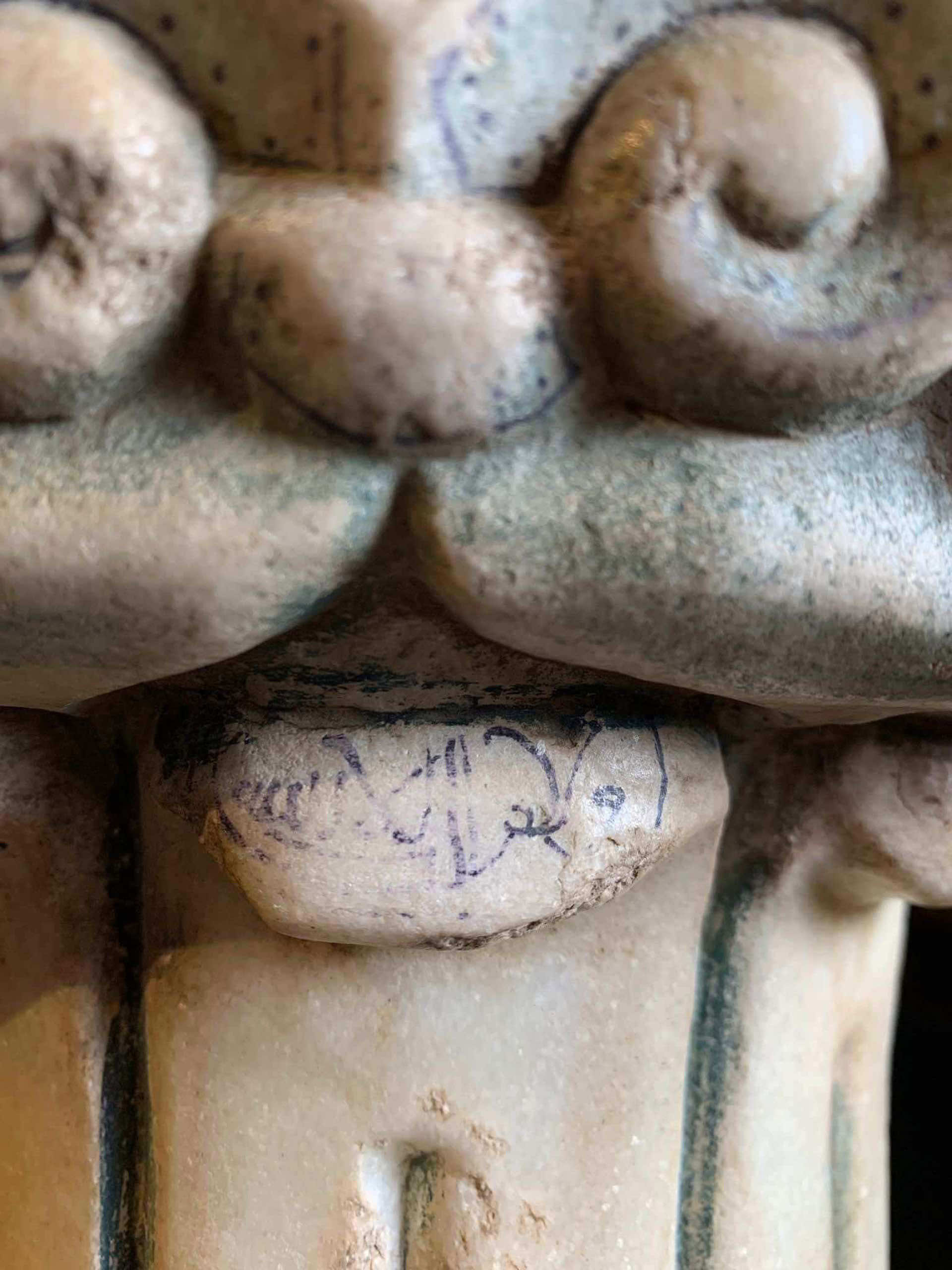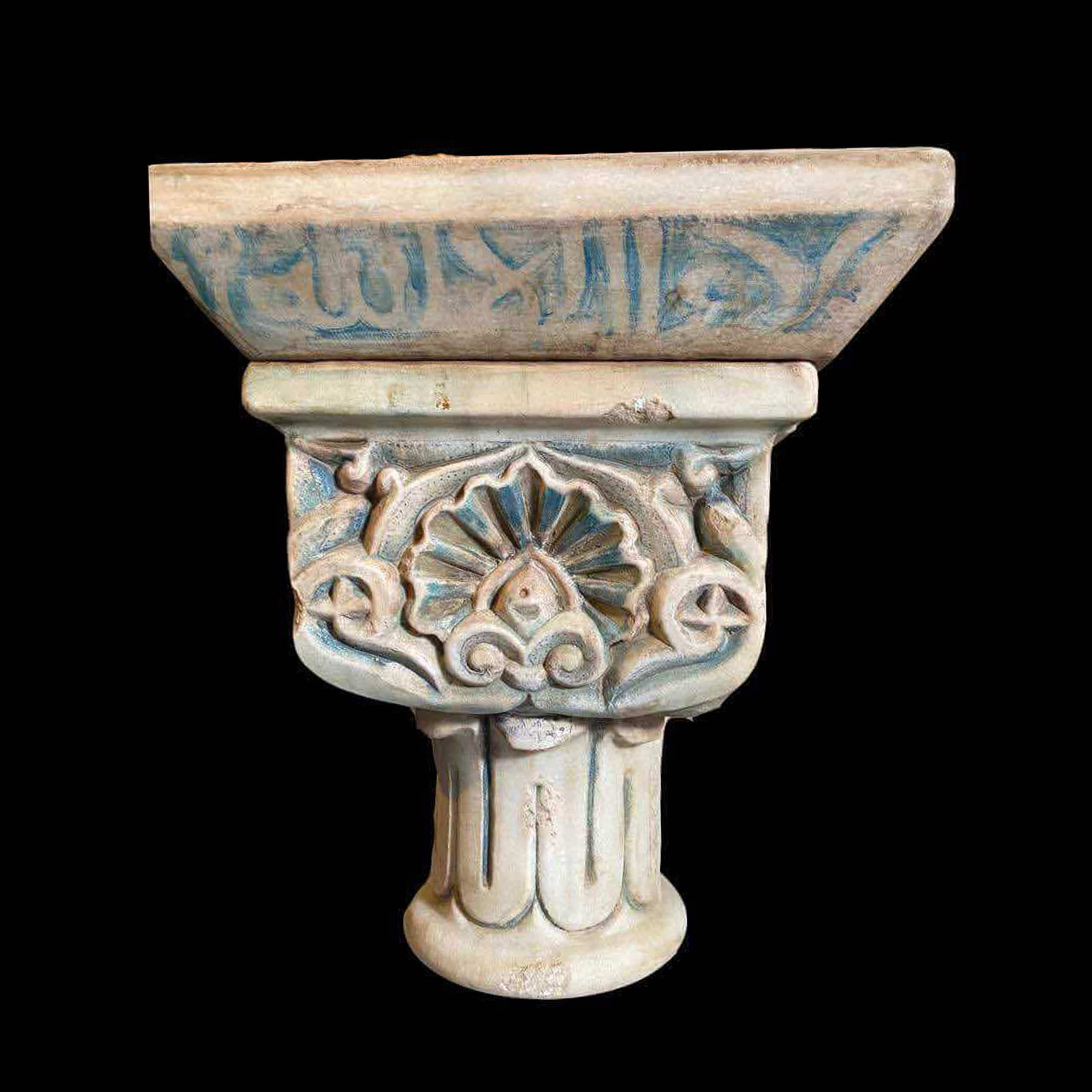 En la parte superior del capitel, el dintel presenta una epigrafía cúfica en tonos azules. Este tipo de caligrafía, con sus formas angulosas y estilizadas, es característico del arte islámico. Más allá de su función decorativa, la caligrafía desempeñaba un papel espiritual. Aunque el texto debe verificarse, es probable que contenga bendiciones, fragmentos coránicos o dedicatorias.