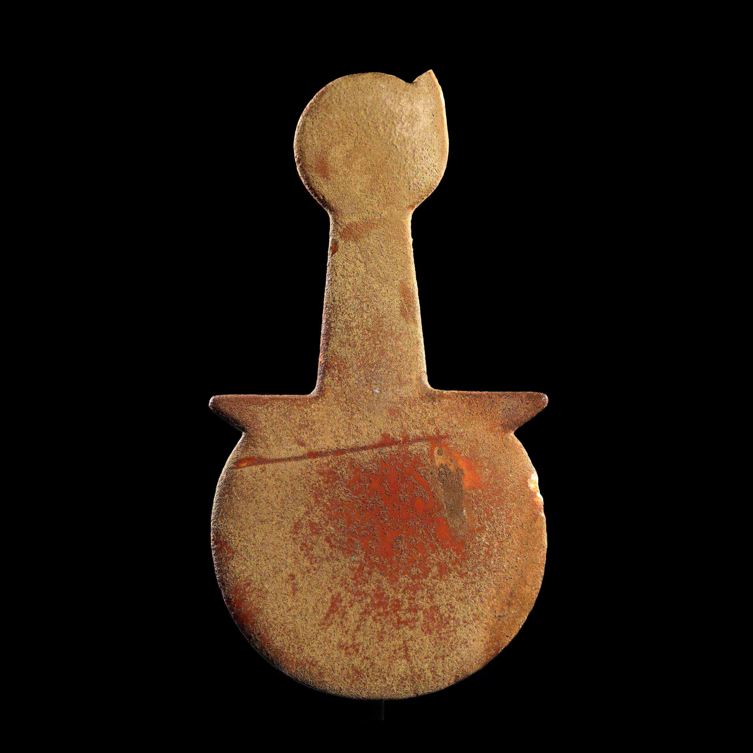 La forma del ídolo responde al tipo Kusura-Beycesultan, una tipología ampliamente reconocida dentro del repertorio escultórico cicládico y anatolio. Su silueta esquemática, dominada por una gran cabeza redonda ligeramente descentrada y un cuerpo en forma de paleta con brazos extendidos de manera angular, remite a una estilización extrema de la figura humana. Las dimensiones de la pieza (27,5 cm de alto por 14,7 cm de ancho) la sitúan dentro de la categoría de los ídolos de tamaño medio-grande, posiblemente destinado a un uso ritual o simbólico dentro de contextos funerarios o de culto doméstico. La superficie presenta una pátina terrosa y restos de pigmentación rojiza, indicios de la interacción con su entorno o incluso de decoraciones originales.