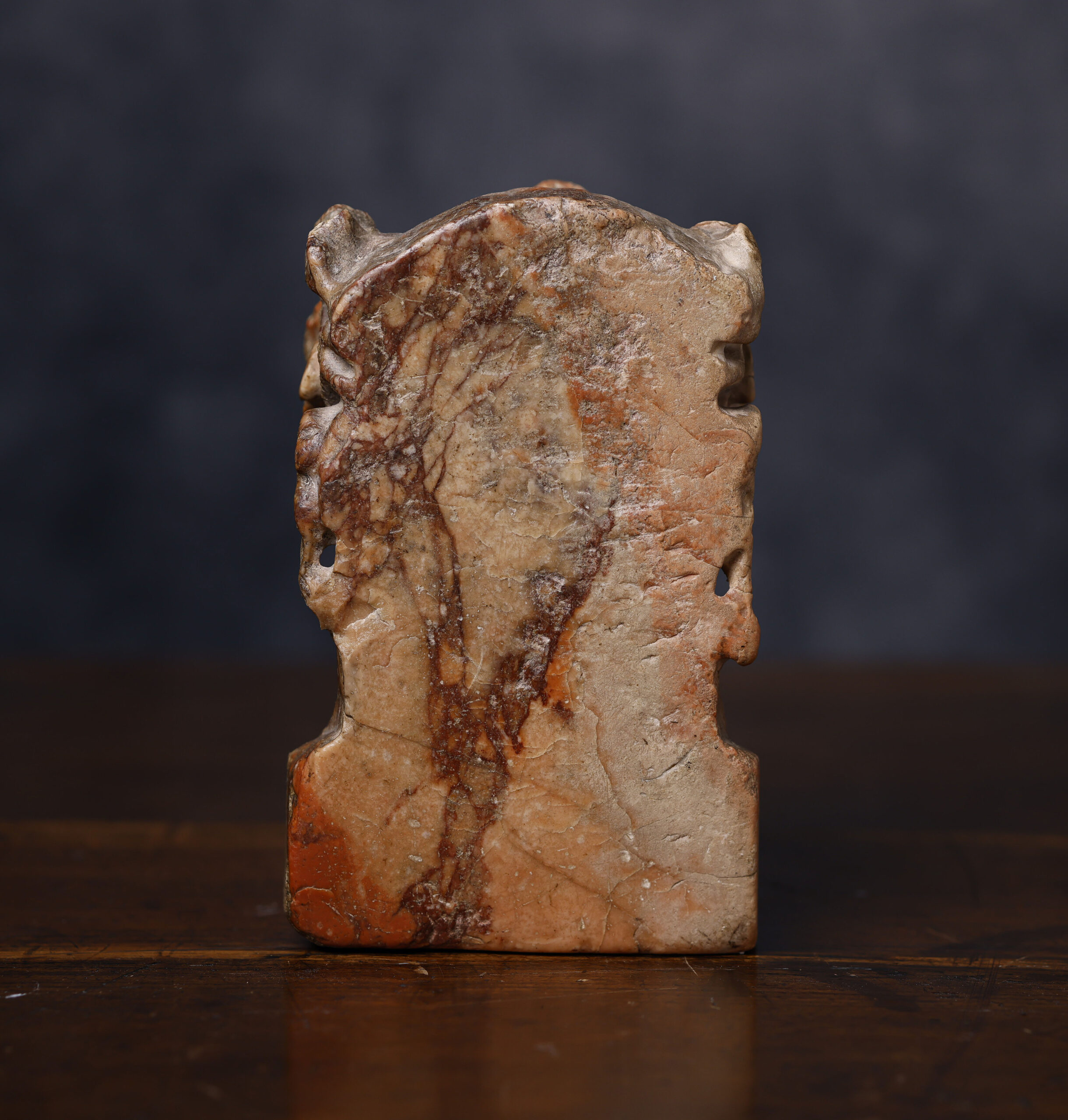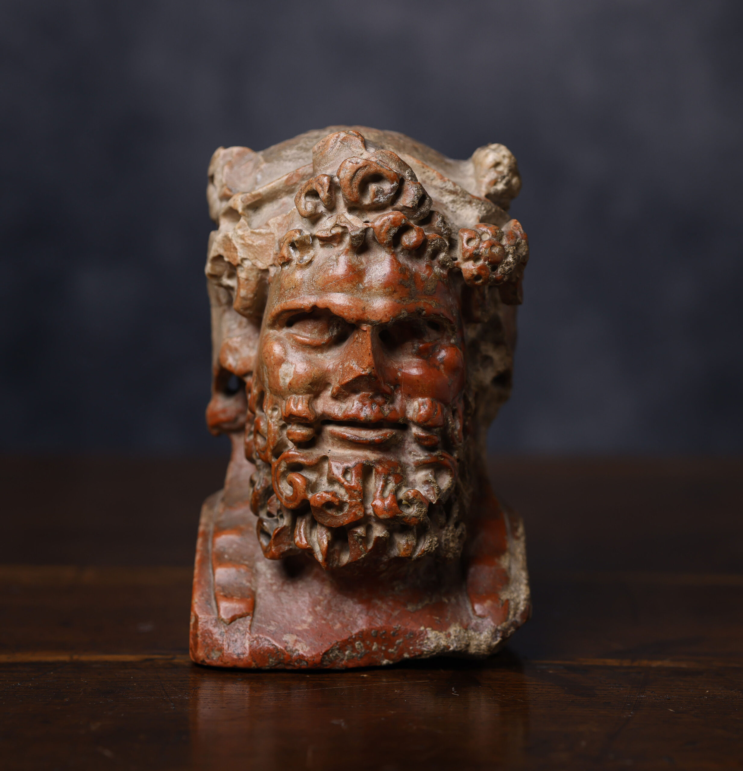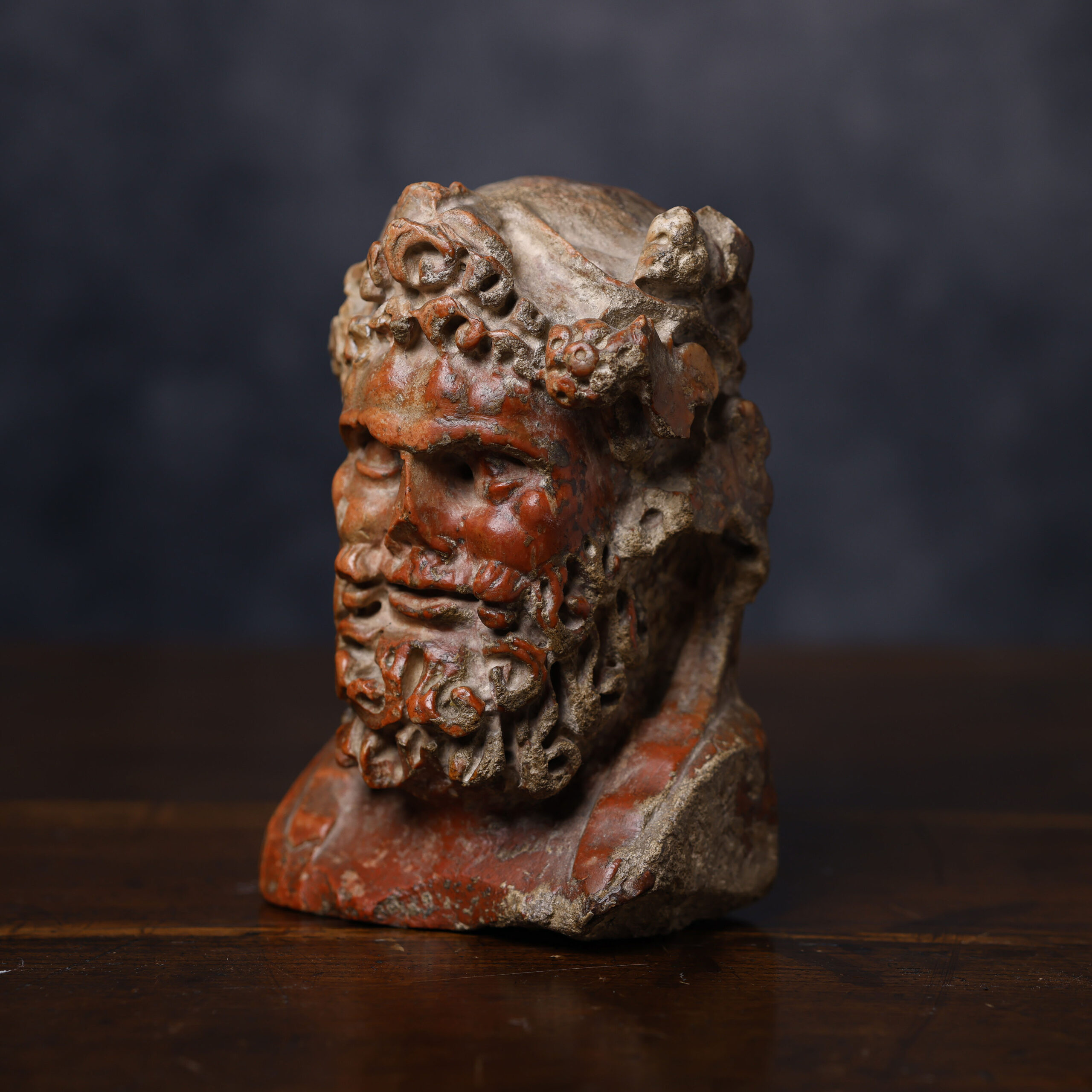 Esta escultura en mármol Rosso Antico, de tono rojo profundo con matices oscuros y superficie pulida, representa al dios Pan. Esta divinidad silvestre se asocia con la fertilidad, la música y la naturaleza. Aunque tiene un origen griego, Pan fue adoptado con entusiasmo por los romanos, que lo integraron en contextos tanto religiosos como decorativos.