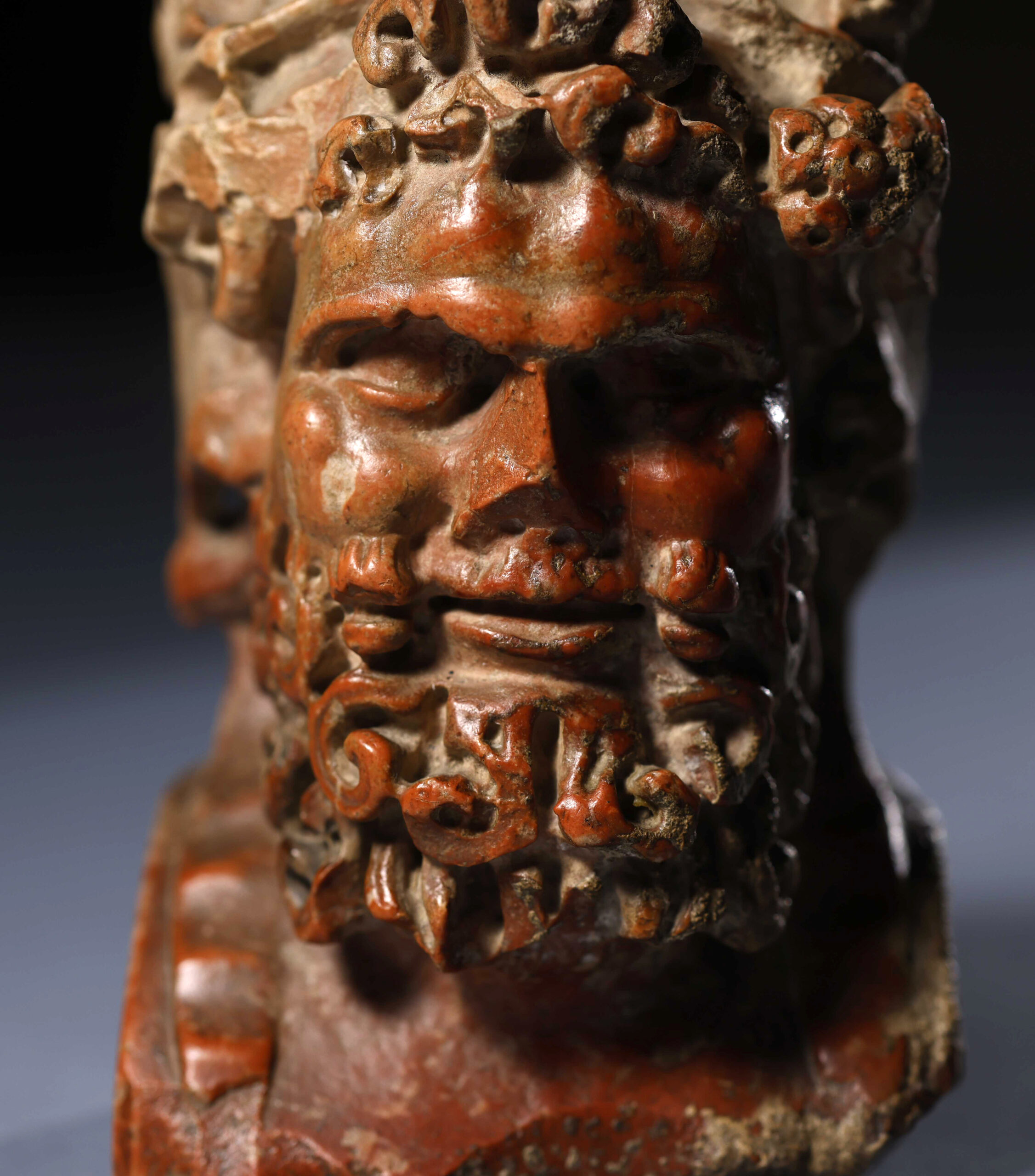 Los detalles en la barba y la corona muestran una ejecución precisa y cuidada. Esto sugiere el trabajo de un taller experimentado, probablemente urbano y con acceso a materiales de prestigio. El mármol Rosso Antico era muy valorado en época romana. Se extraía en el norte de África y Asia Menor, y se reservaba para obras de lujo. Su color rojizo refuerza la relación de Pan con la tierra, la vitalidad y lo salvaje.
