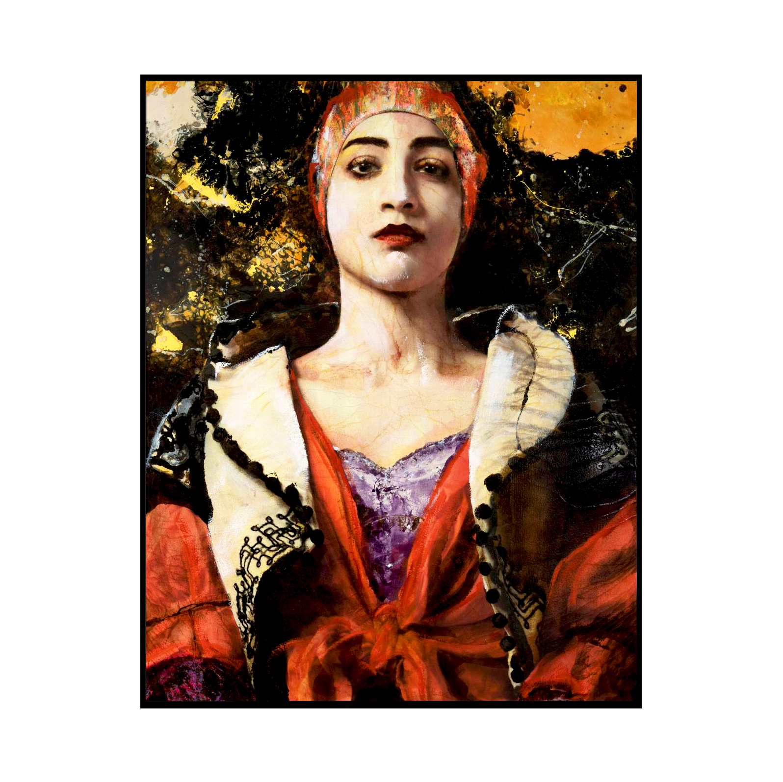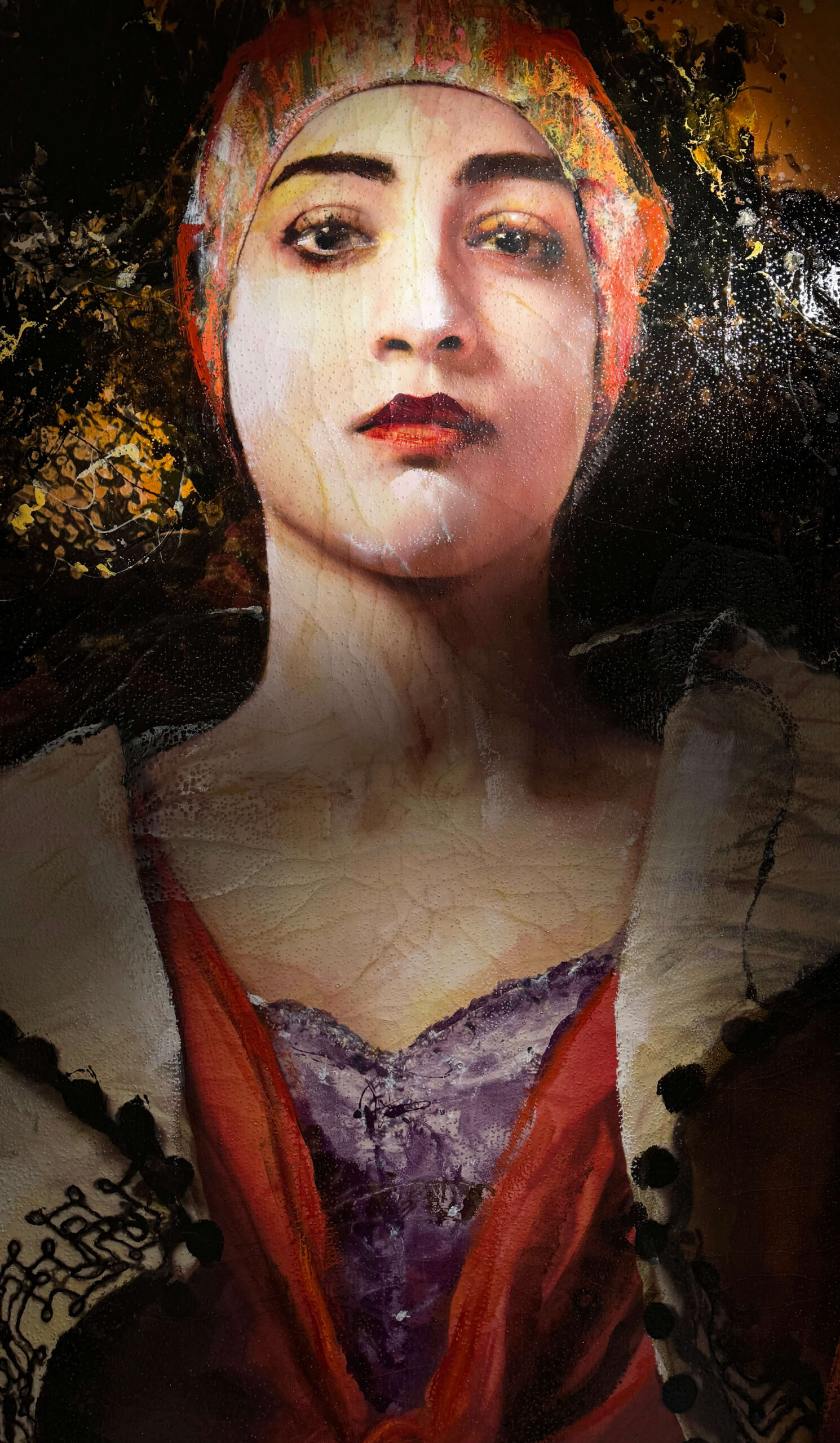 La obra representa un retrato femenino monumental que captura la esencia del estilo de Cabellut. El rostro de la joven destaca por sus ojos negros y la delicadeza de unos tonos de piel que parecen agrietarse como porcelana. Su técnica hiperrealista contrasta con un fondo informal, con gotas que serpentean sobre la figura, creando texturas magnéticas que provocan la curiosidad del espectador.