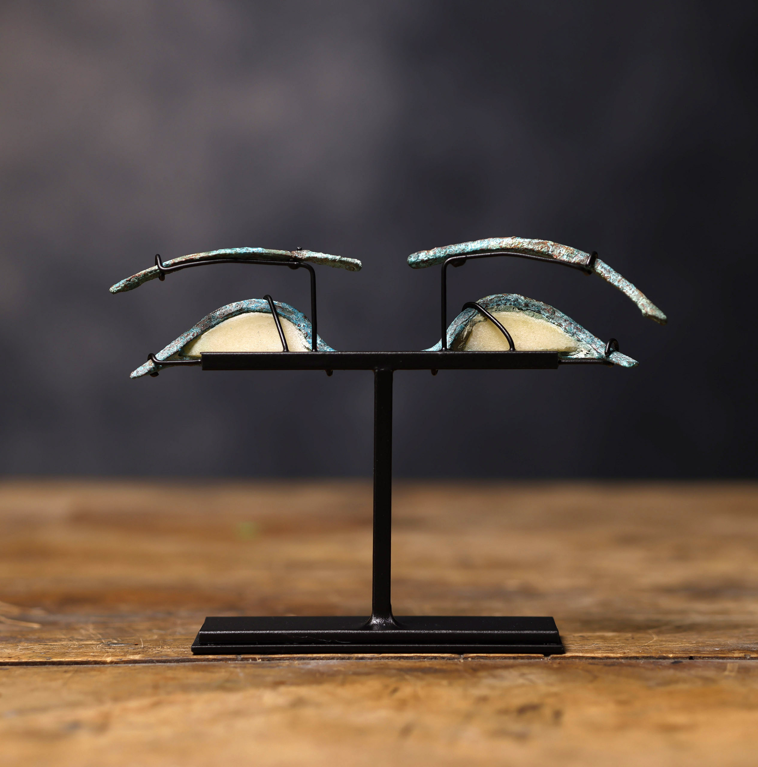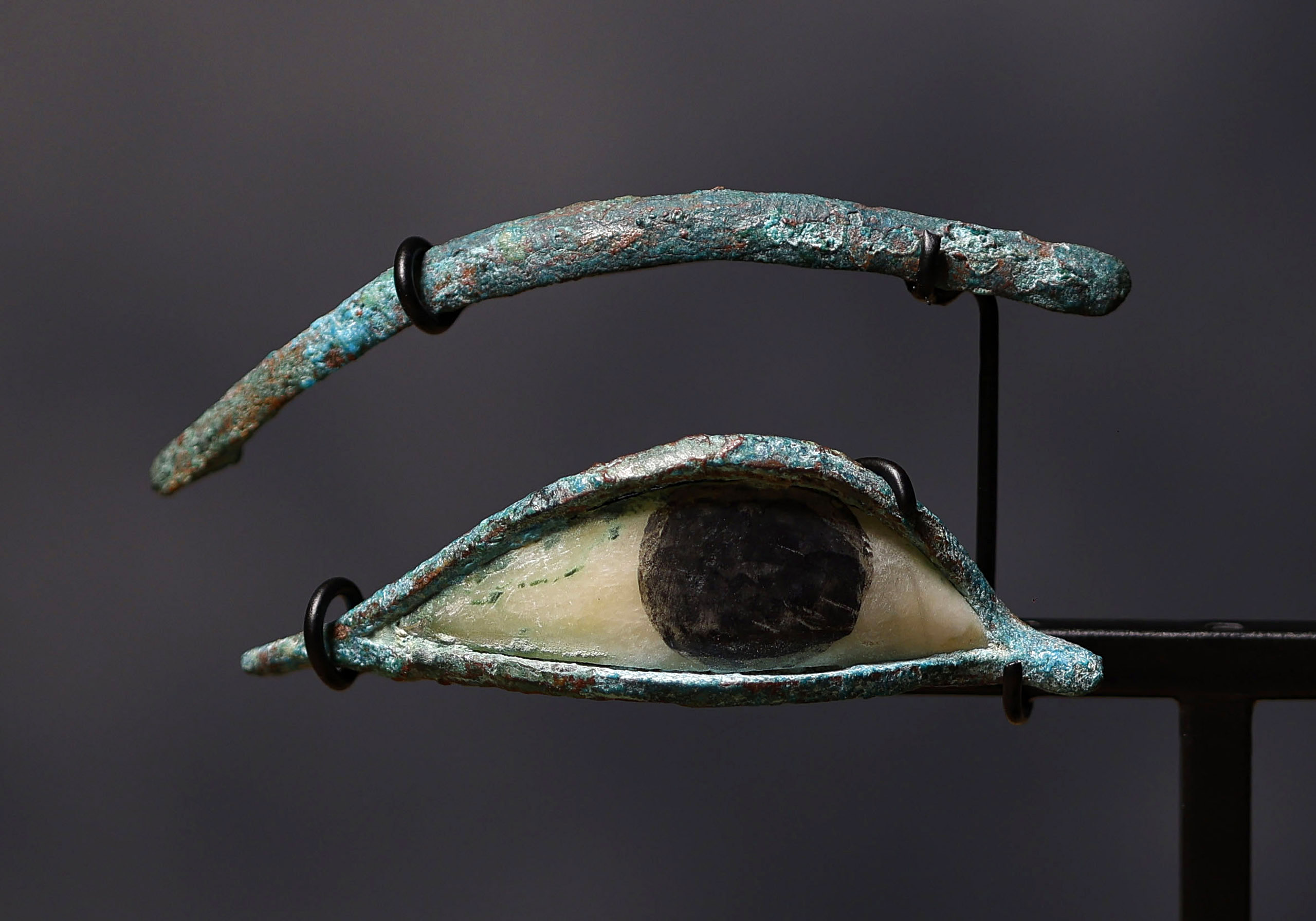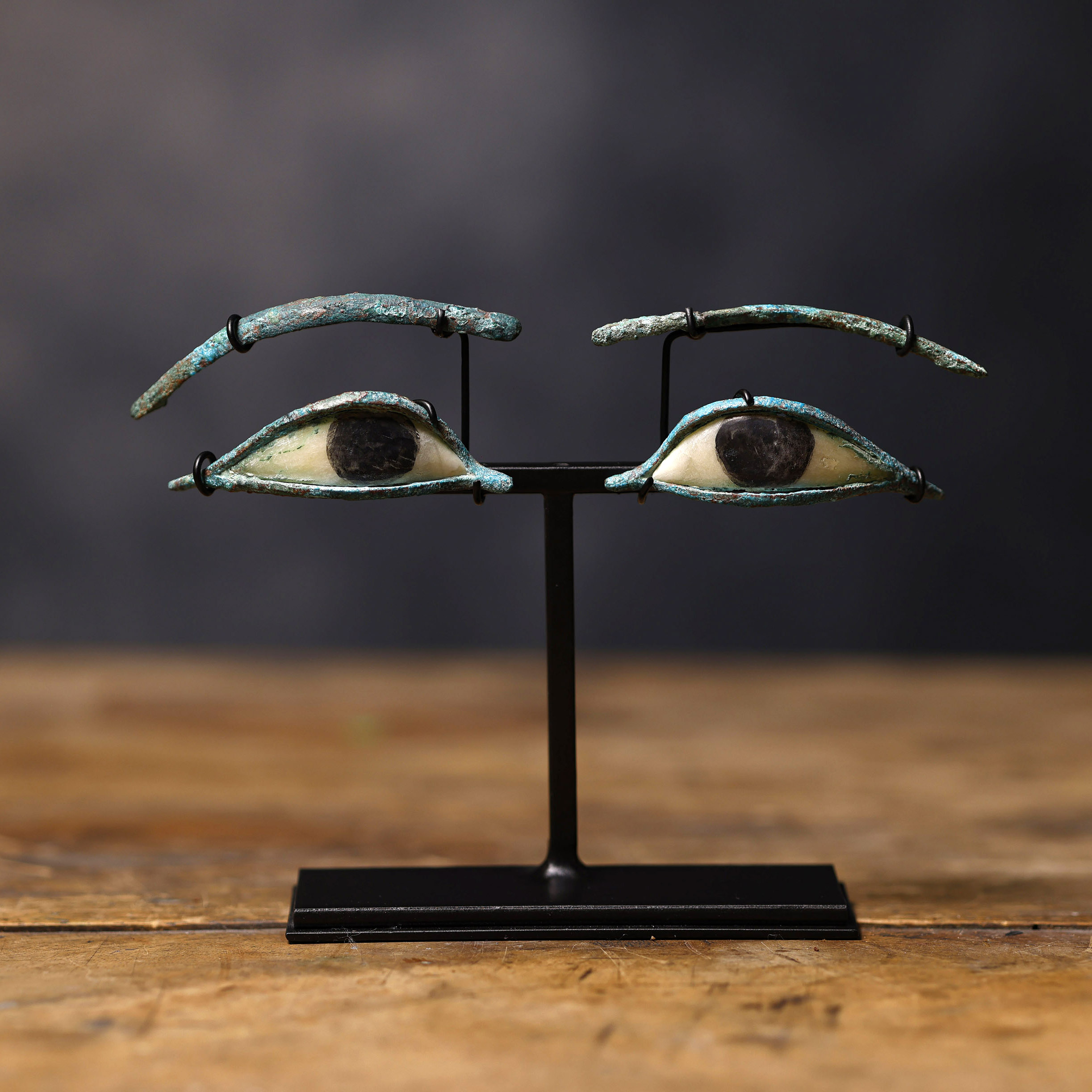 Este par de ojos egipcios de sarcófago pertenece a la Baja Época (722 – 332 a.C.), un periodo en el que la tradición funeraria del Antiguo Egipto mantenía un alto grado de sofisticación técnica y un profundo simbolismo religioso. Elaborados con gran maestría, combinan bronce para el marco y las cejas, alabastro para la esclerótica y piedra oscura para la pupila, creando un efecto de realismo que transmitía la presencia vigilante del difunto. La pátina verde-azulada en el metal es producto de siglos de oxidación, añadiendo una textura arqueológica que acentúa su autenticidad.