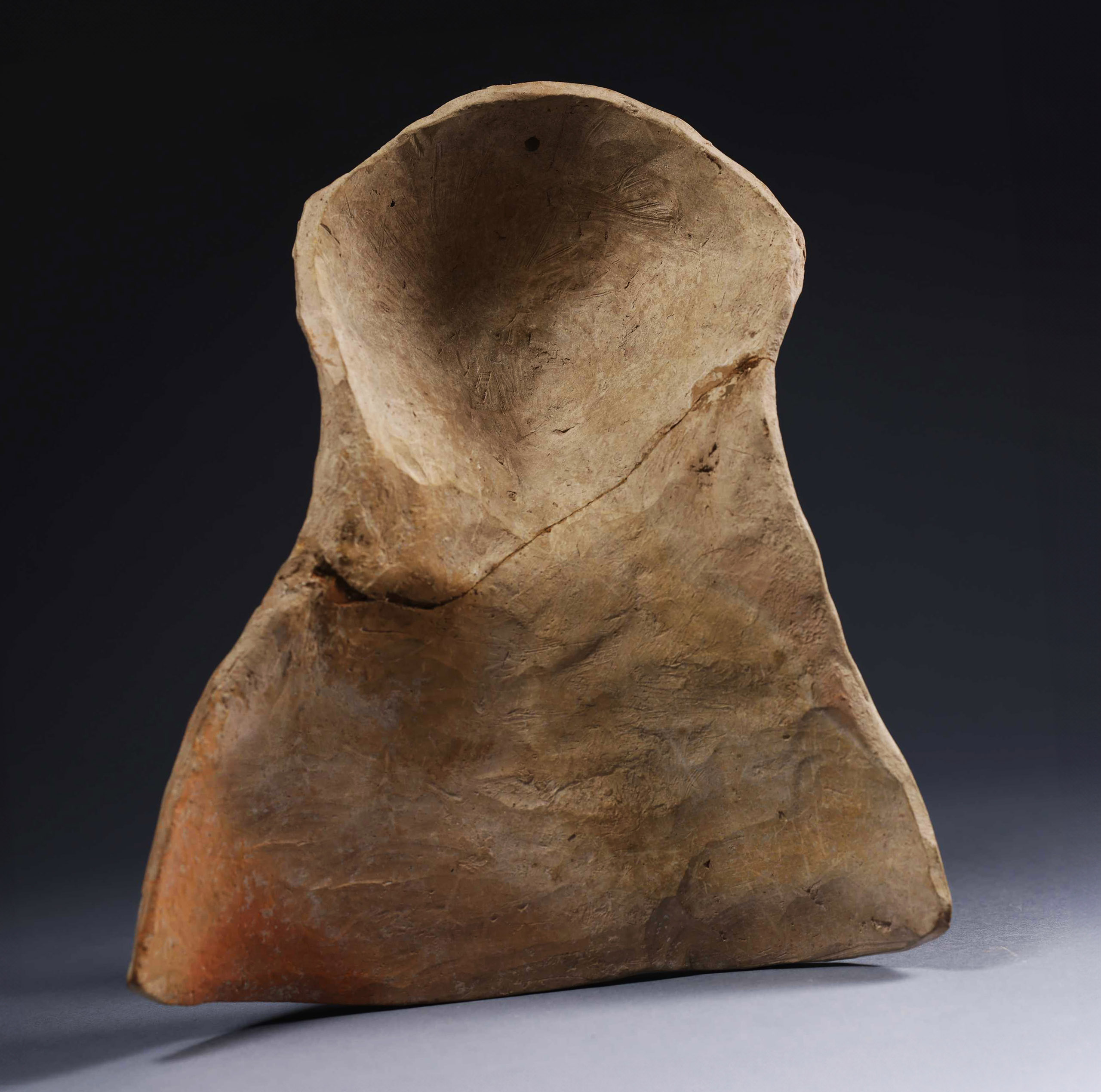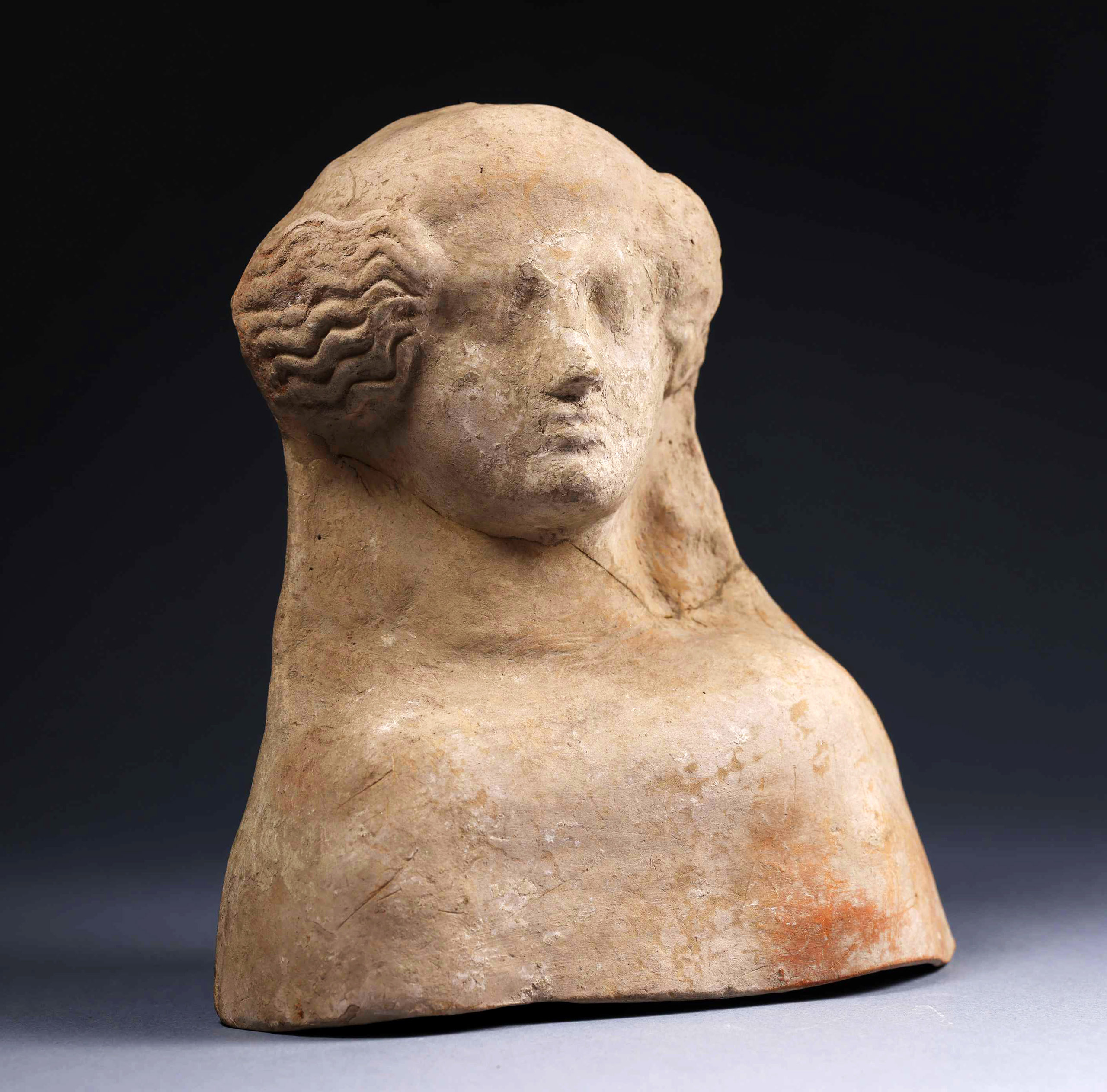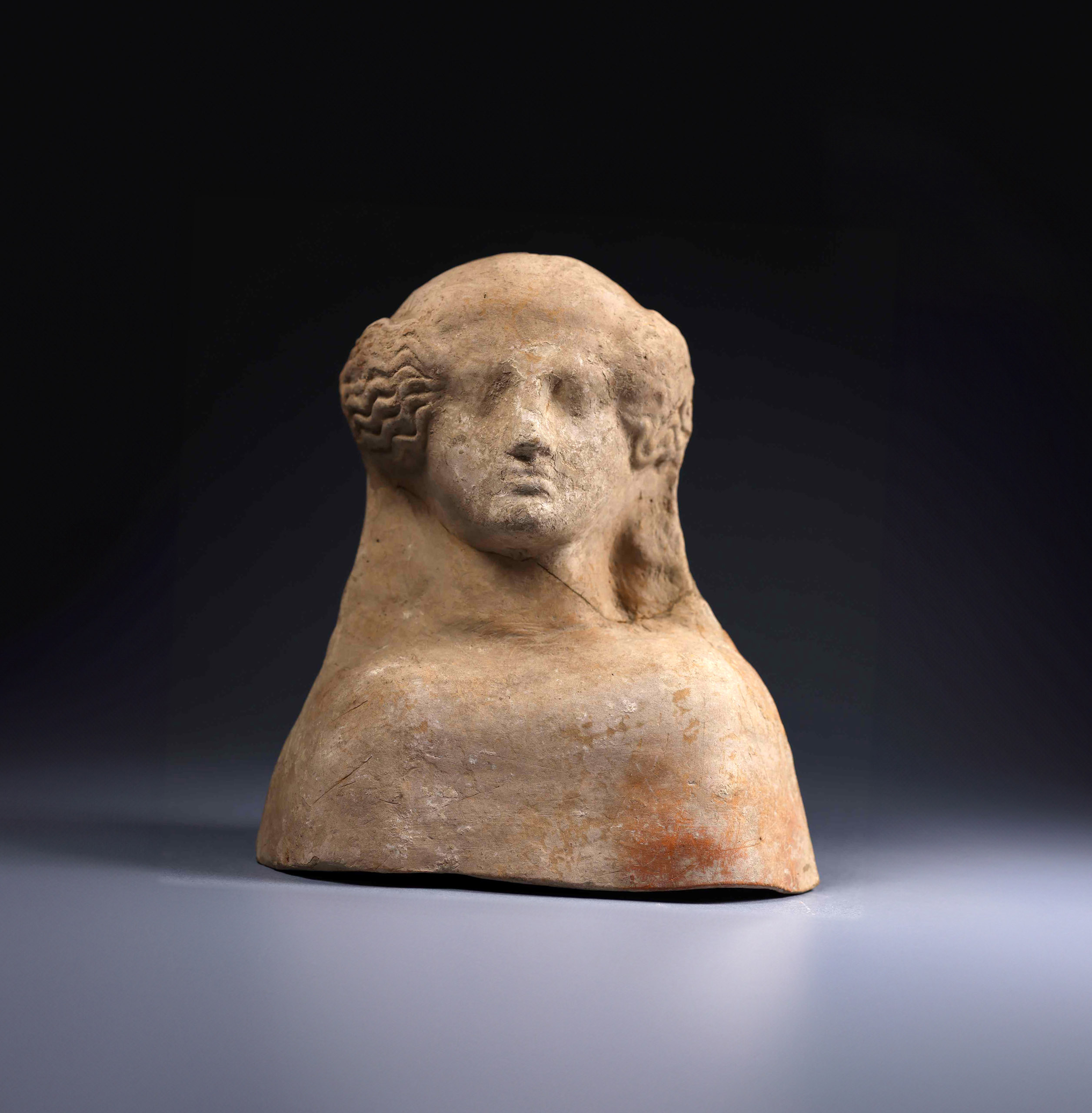 Placa en terracota del arte fenicio, fechada entre los siglos V y IV a.C., que representa a Deméter, una figura central de la mitología griega asociada con la agricultura y la fertilidad.