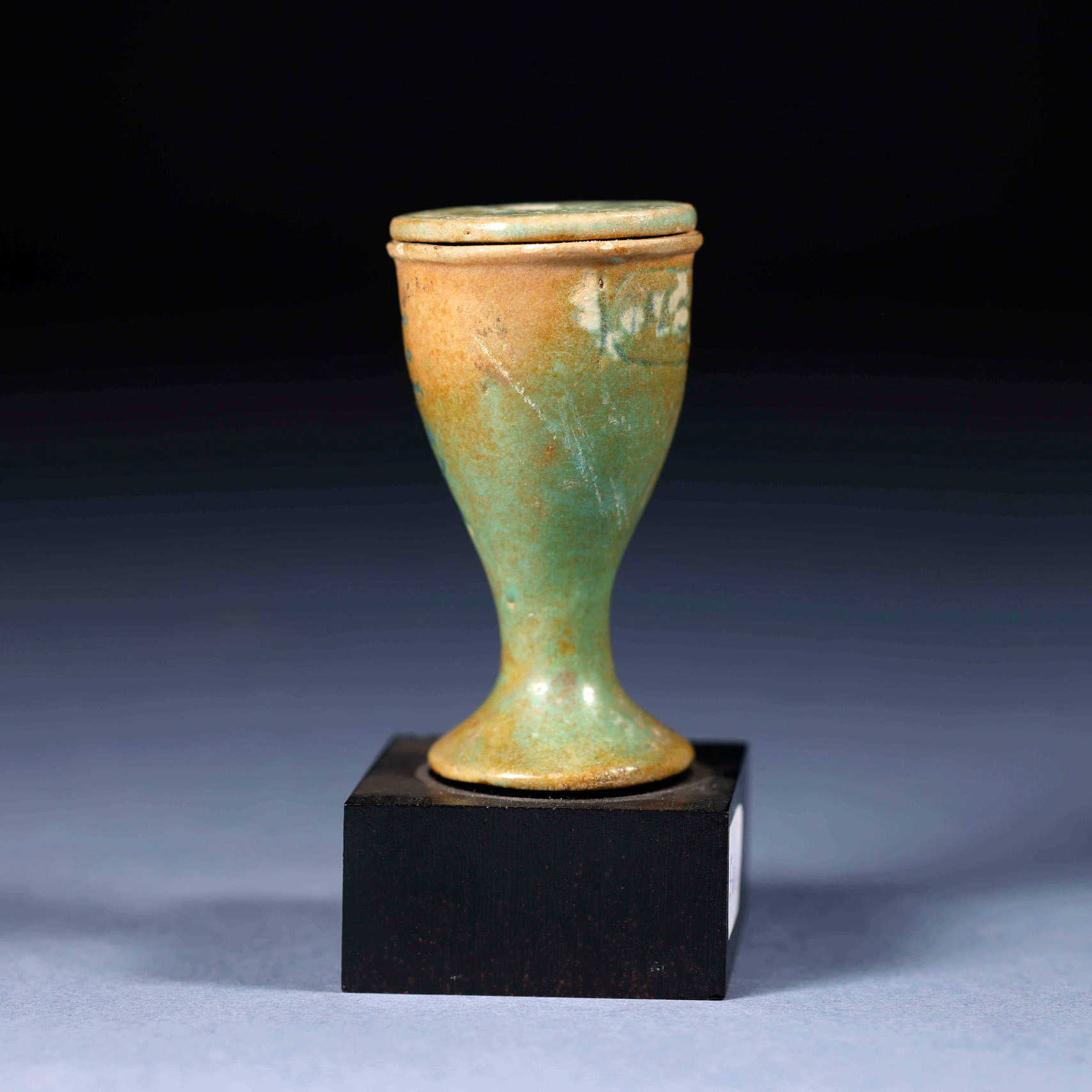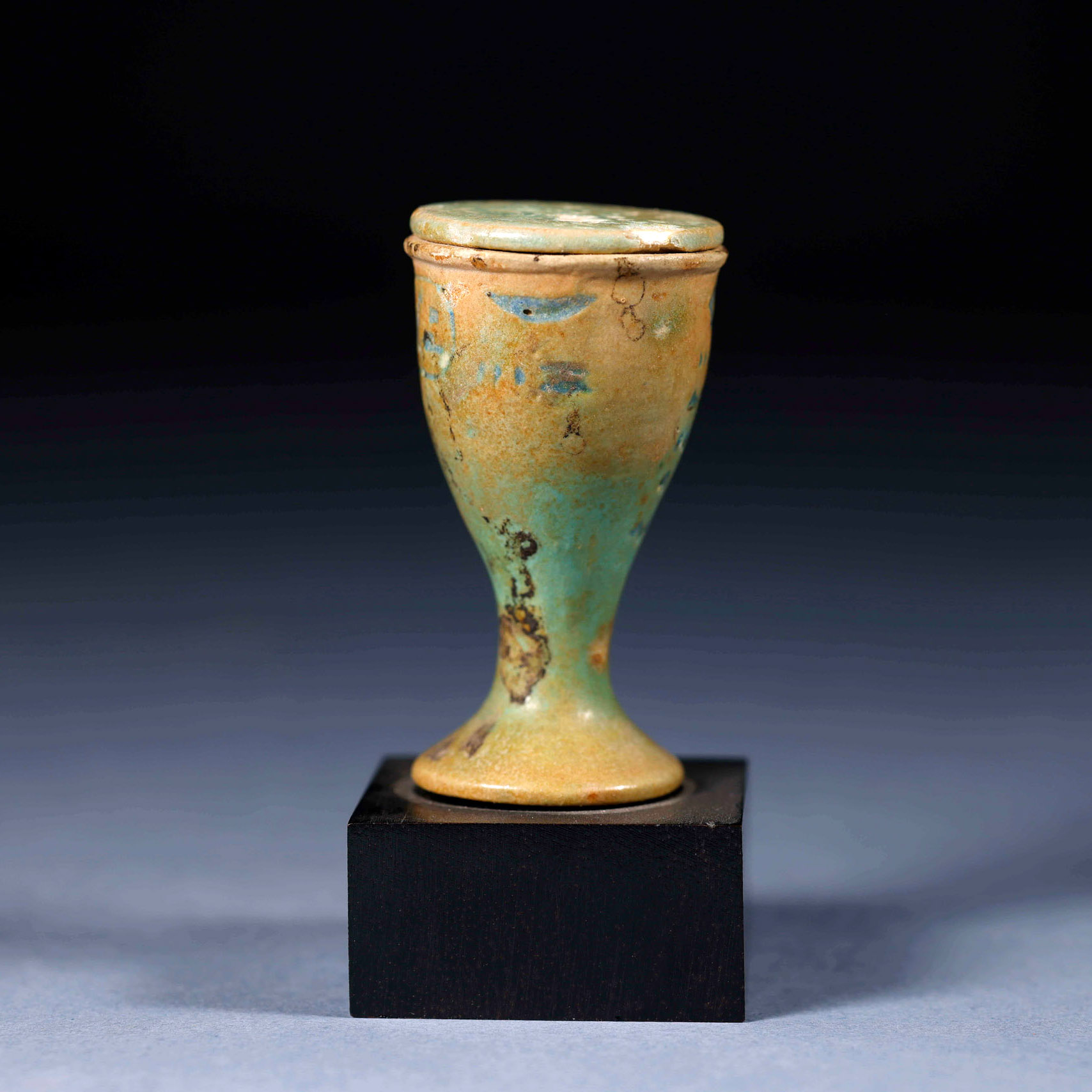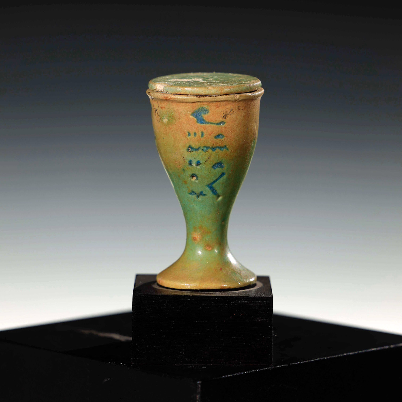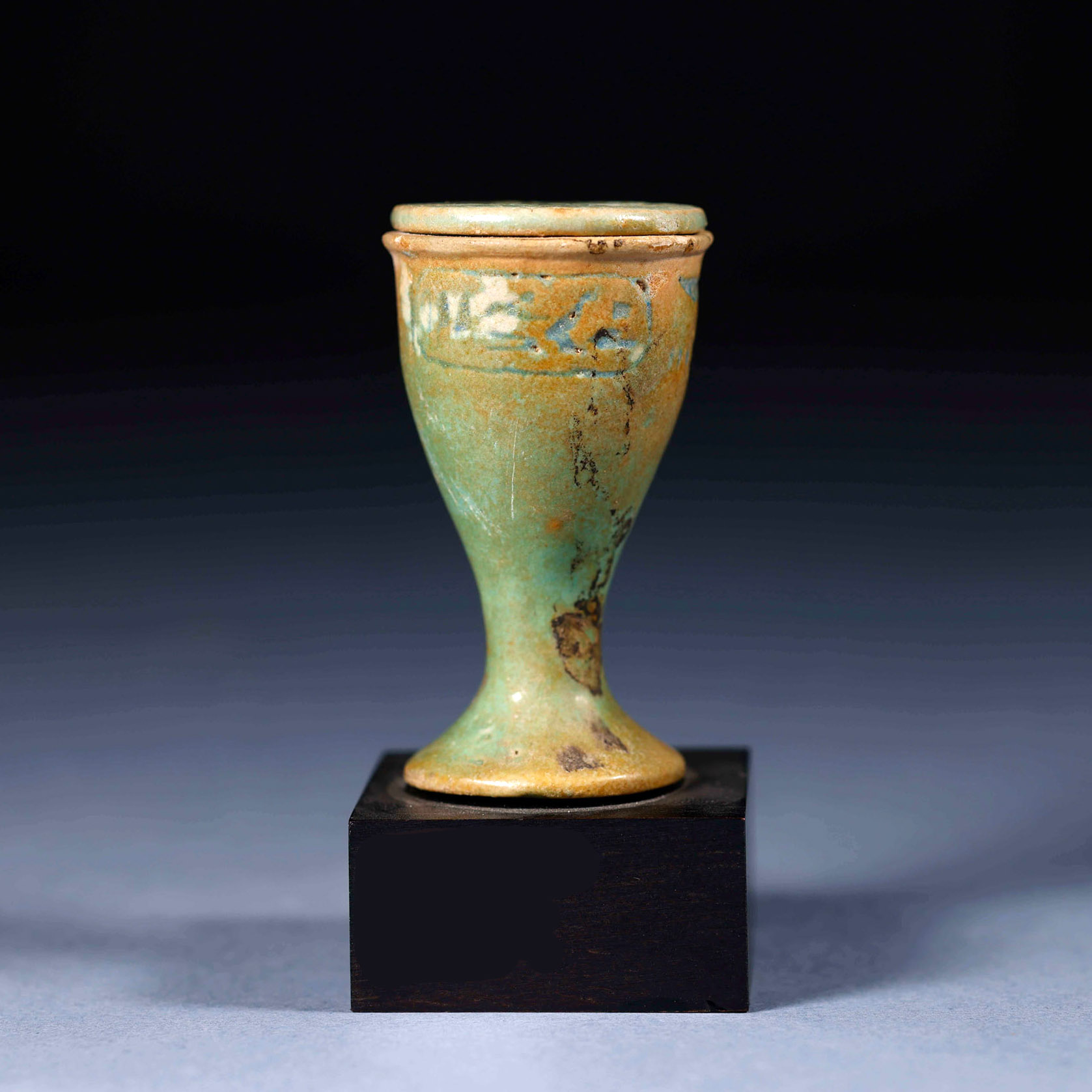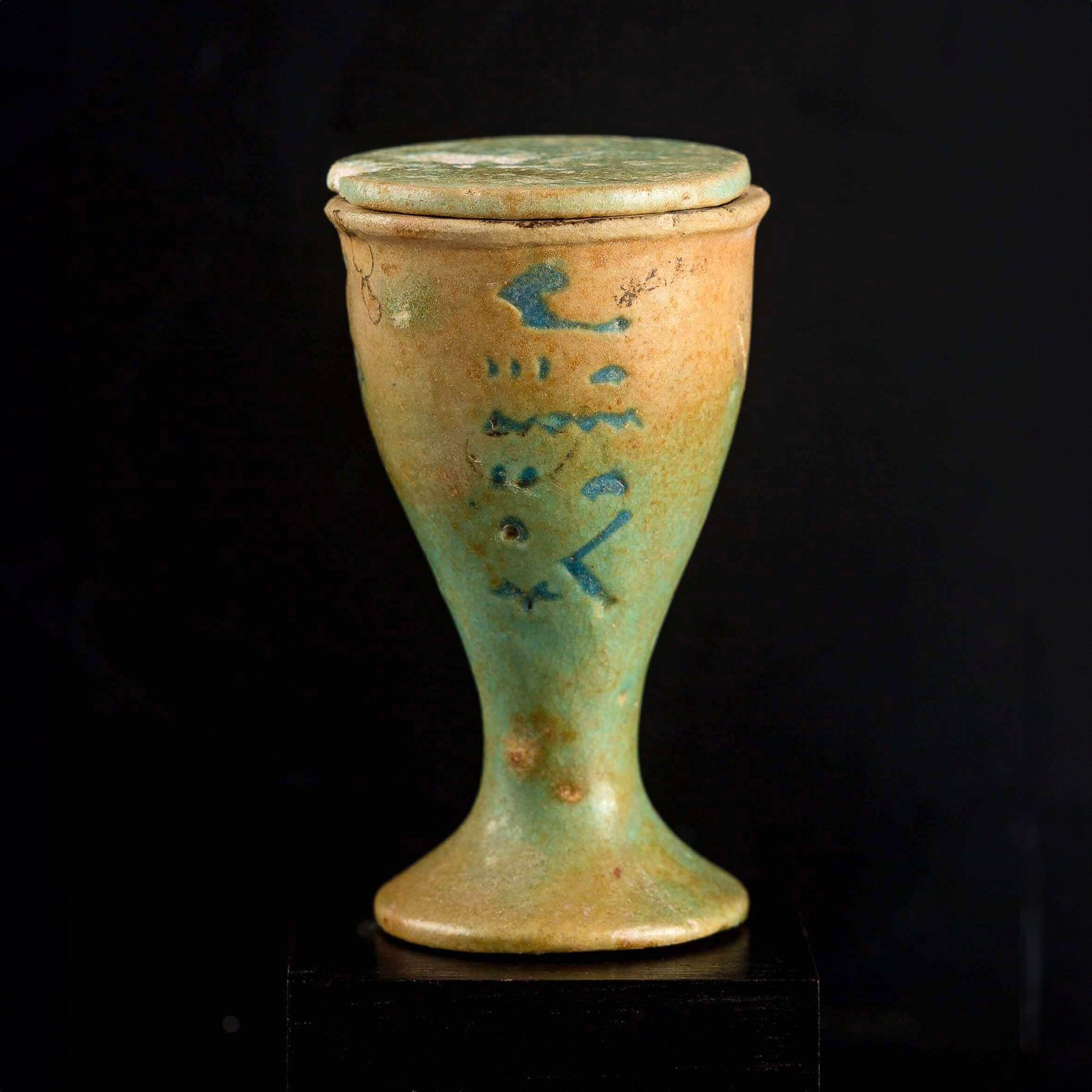 Vaso para ungüentos en forma de copa con tapa. En la parte frontal con inscripción jeroglífica y parte trasera con cartucho de rey Ptolemaico, realizados en fayenza azul.