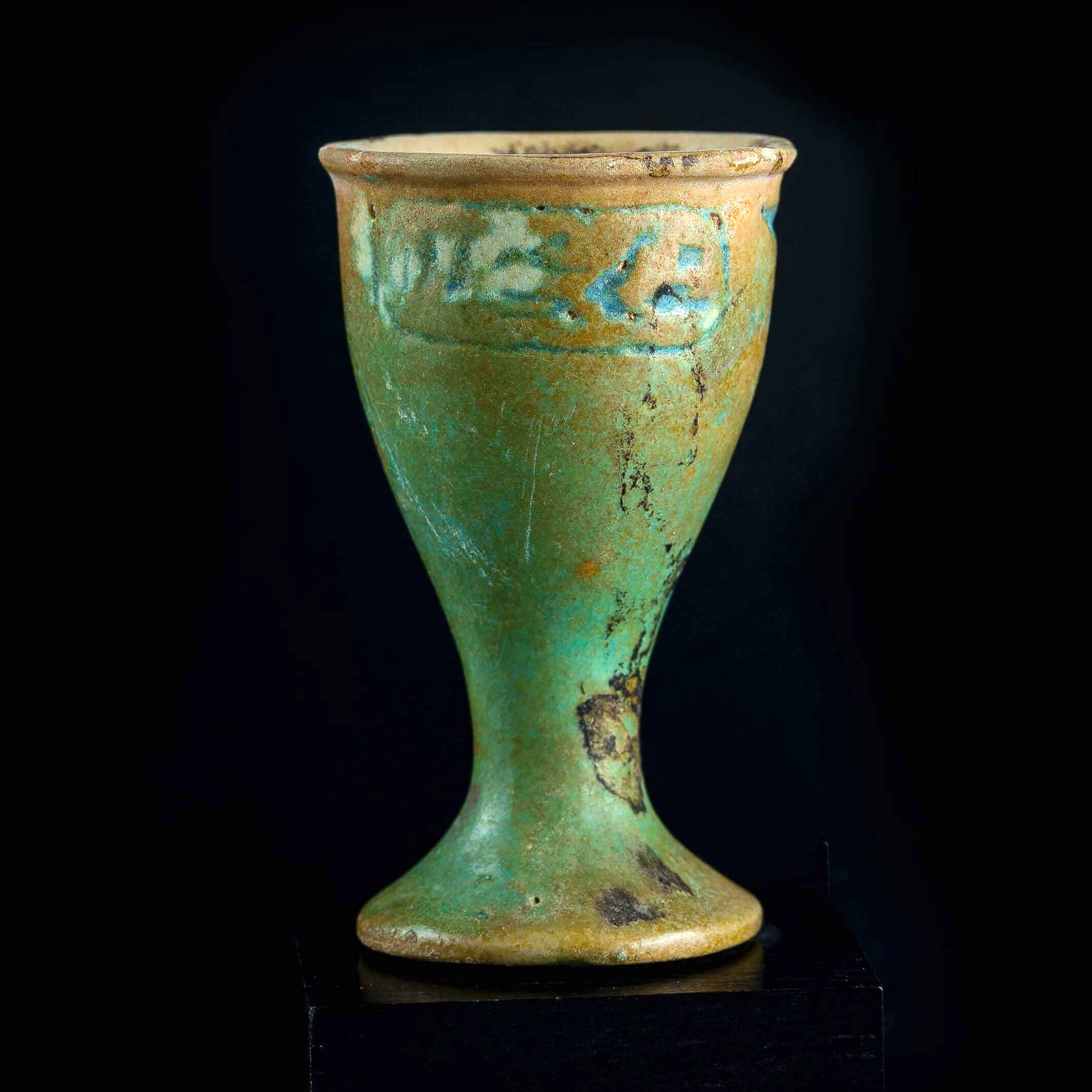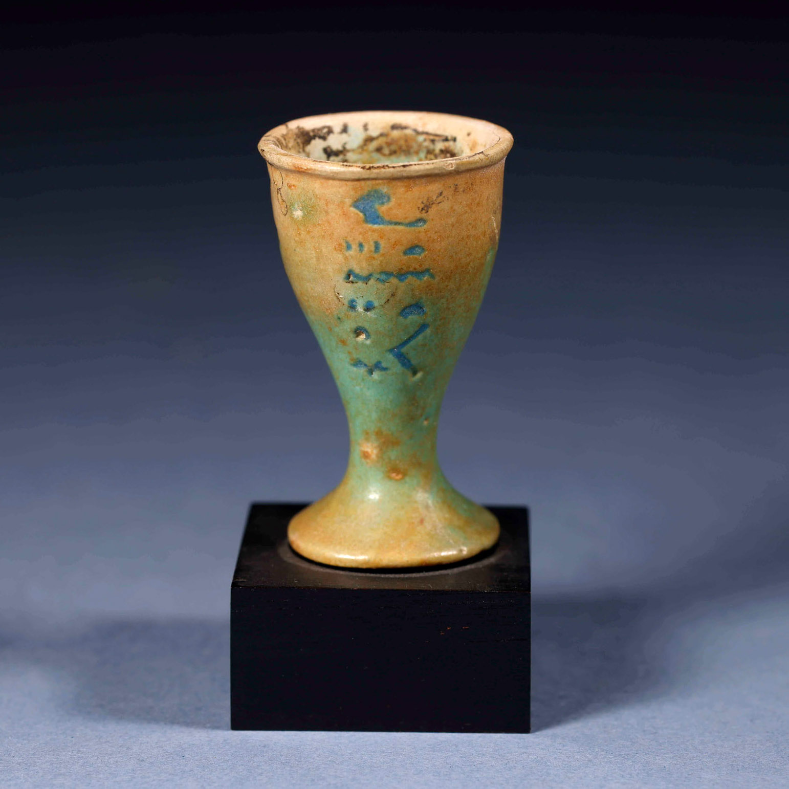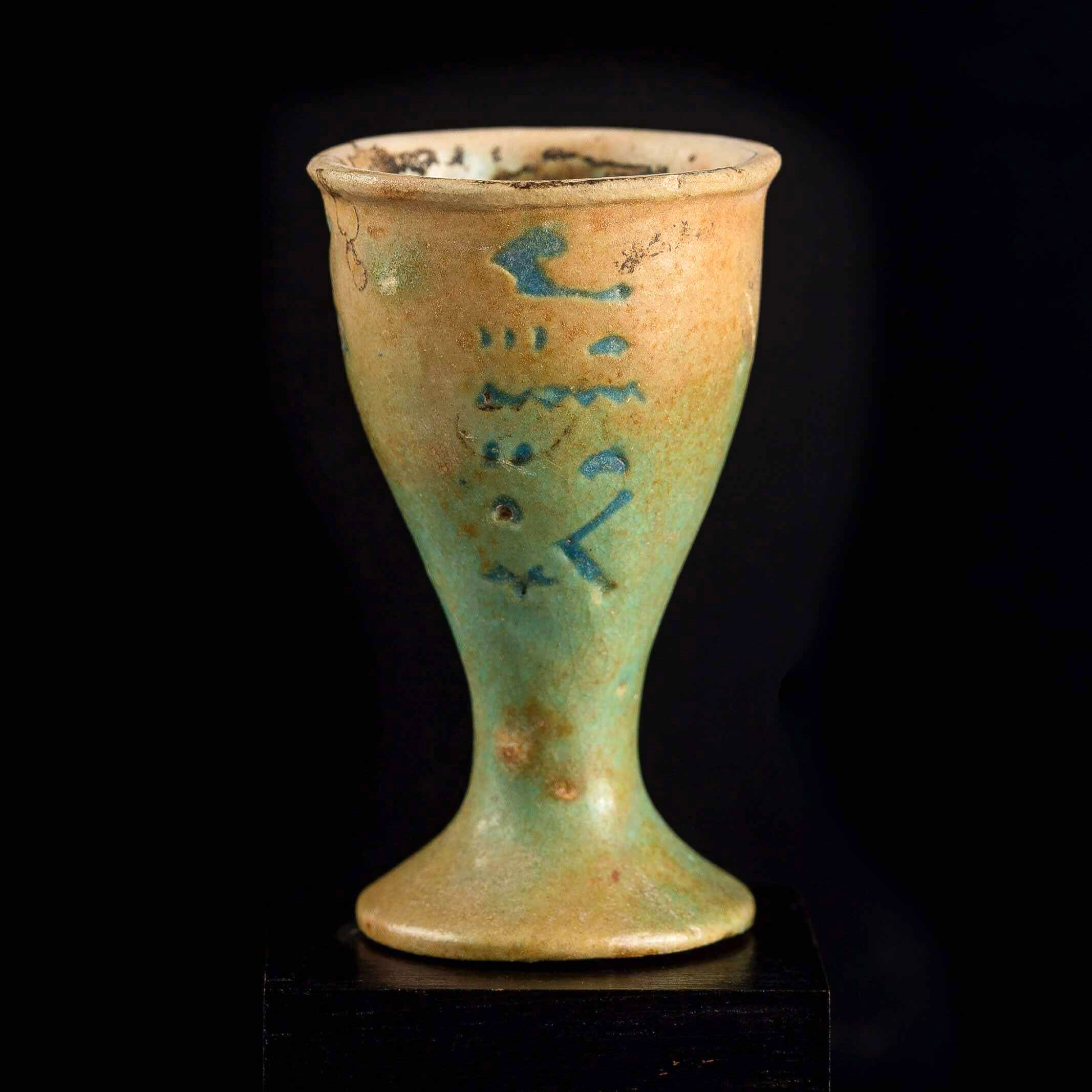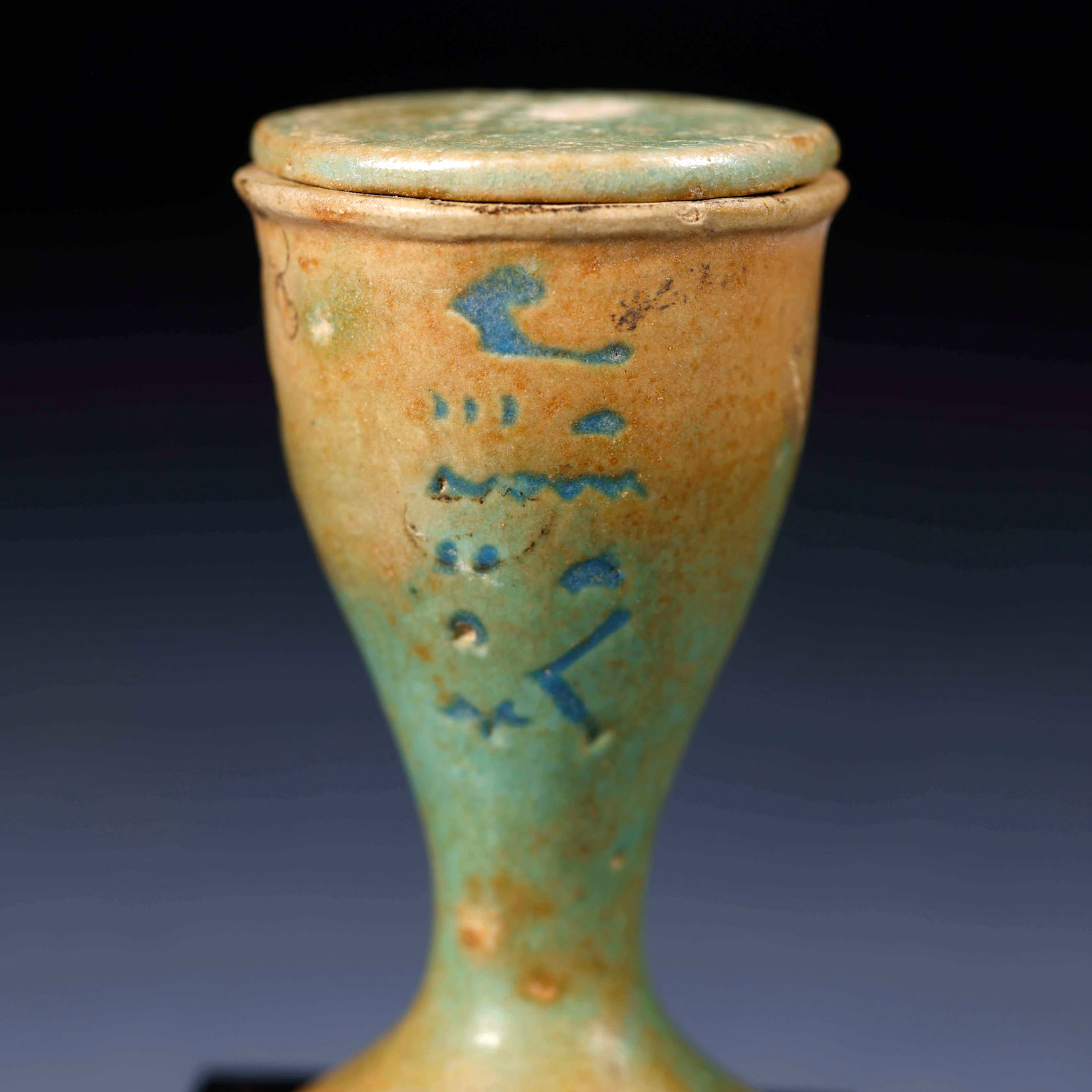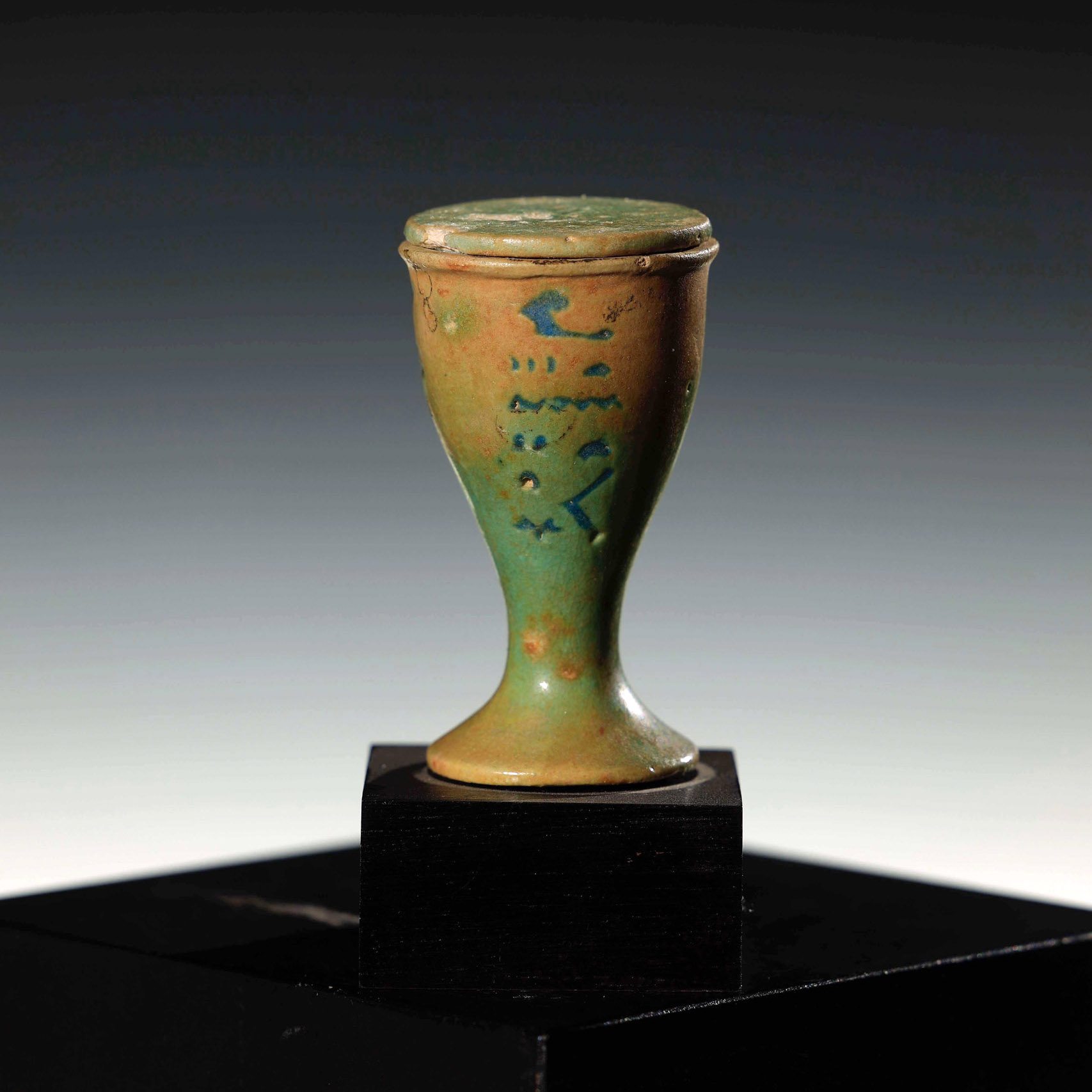 Vaso para ungüentos en forma de copa con tapa. En la parte frontal con inscripción jeroglífica y parte trasera con cartucho de rey Ptolemaico, realizados en fayenza azul.