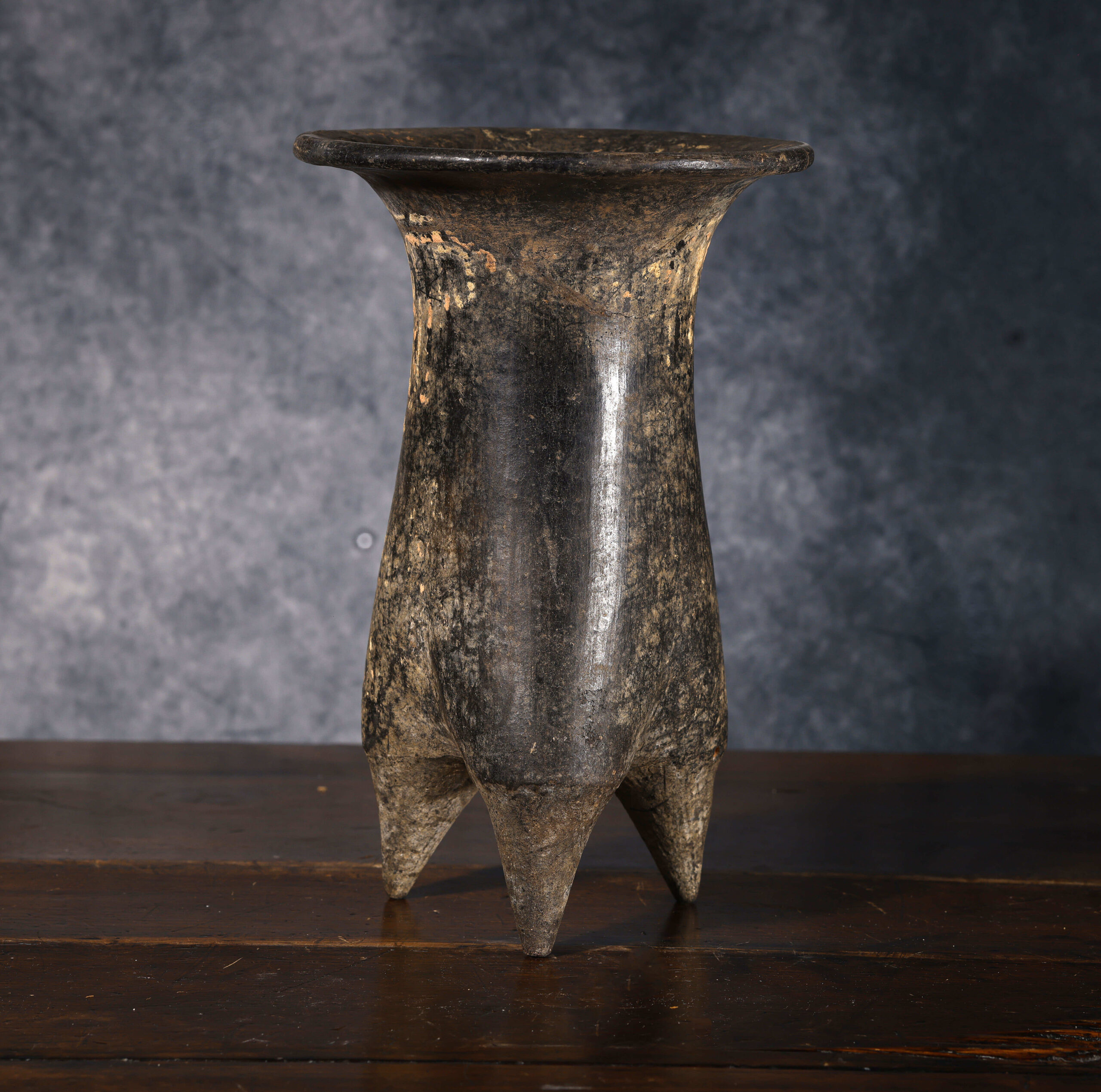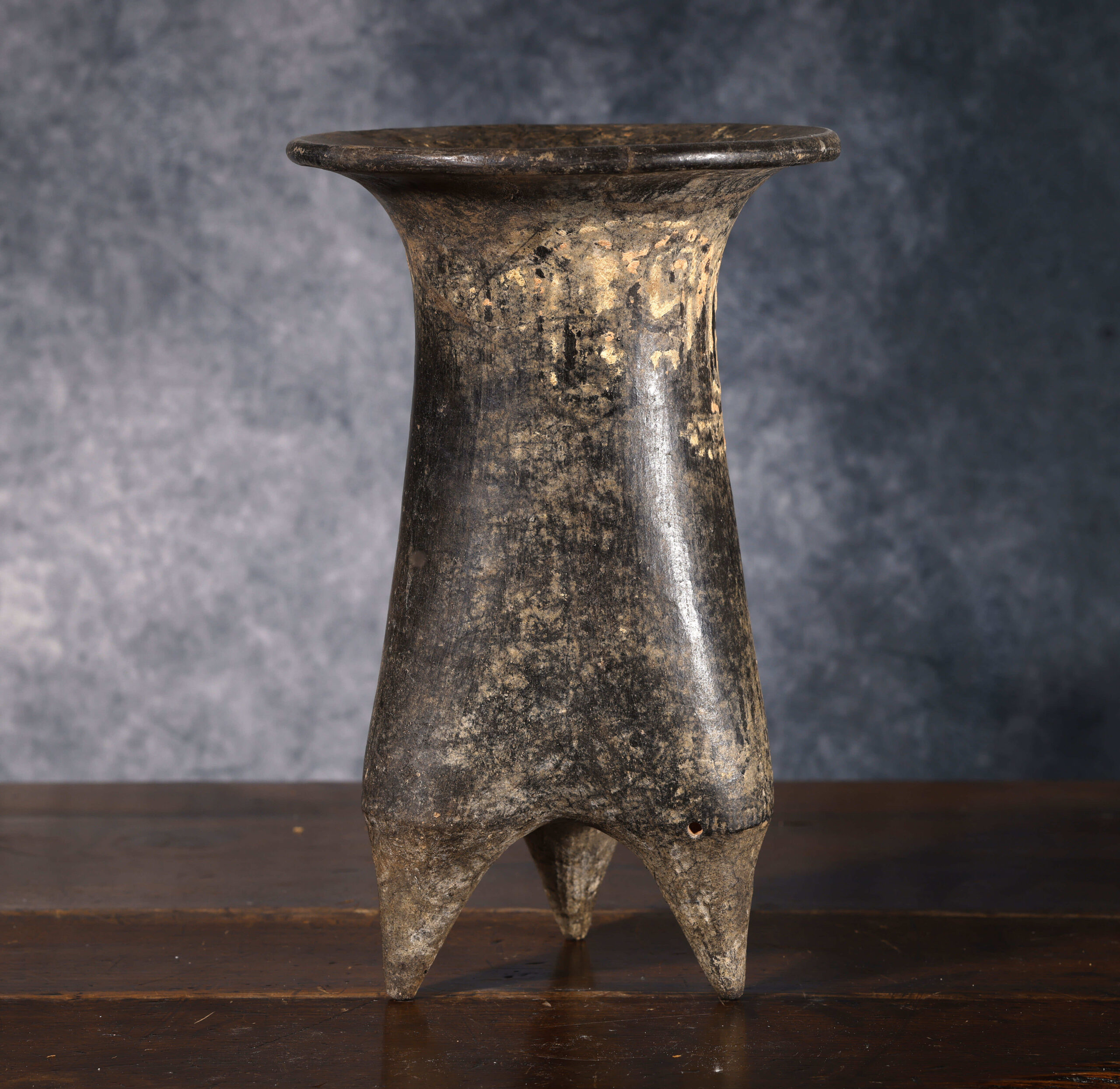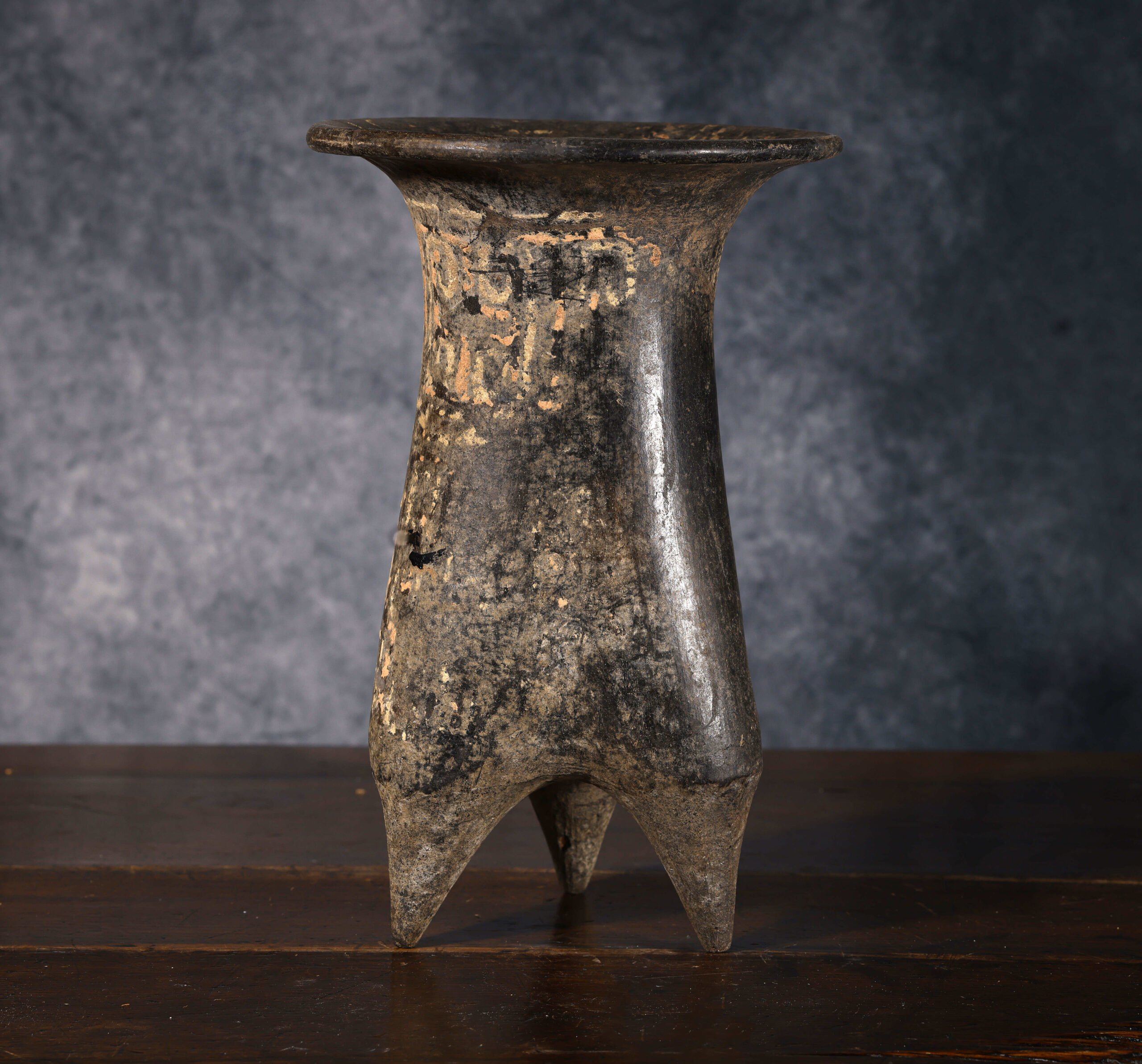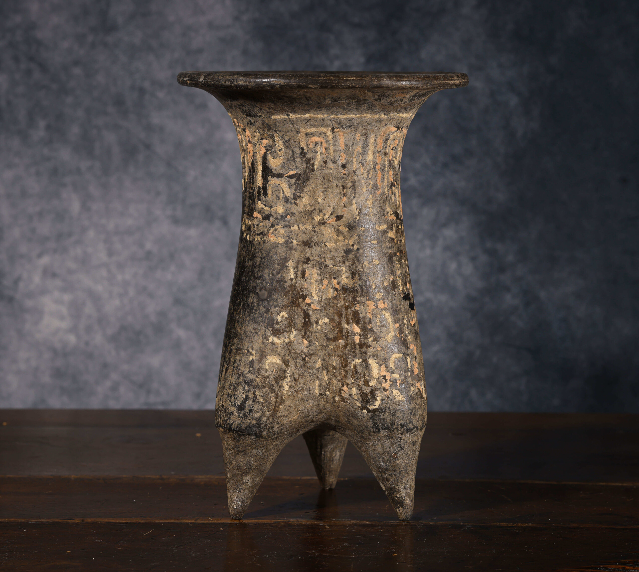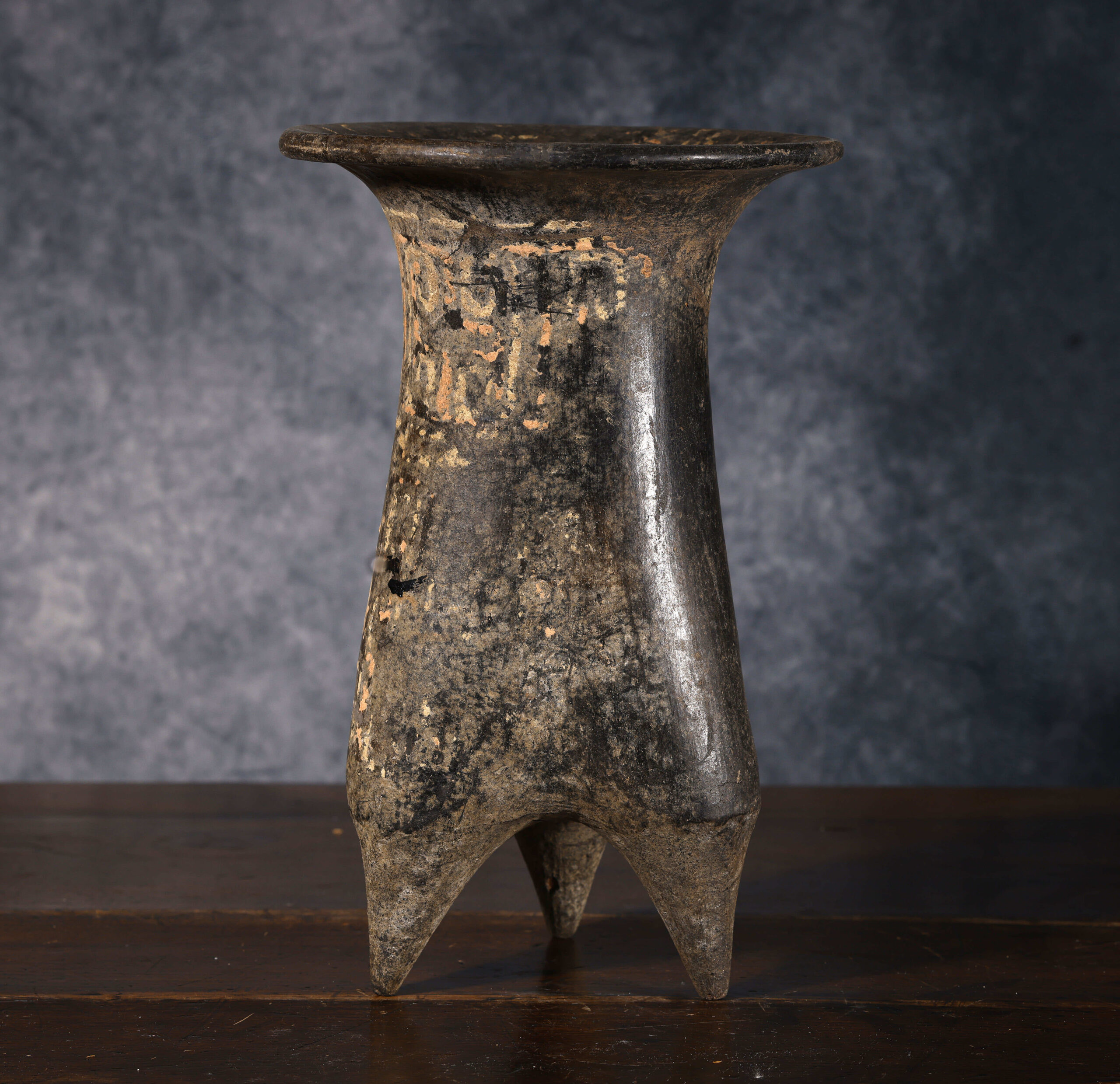 Este vaso trípode de cerámica, datado en el Periodo Shang (1600 – 1046 a.C.), constituye un ejemplo relevante de la producción alfarera ritual en la antigua China. La pieza presenta un cuerpo alto y estilizado, ligeramente troncocónico, que descansa sobre tres patas puntiagudas características de los recipientes trípodes, los cuales tenían una fuerte connotación ceremonial. Su superficie conserva aún restos de decoración pintada o incisa, con motivos que parecen evocar formas geométricas y signos, algunos de ellos semejantes a caracteres epigráficos tempranos. Estas marcas refuerzan su función ritual y lo vinculan con el complejo sistema simbólico y religioso del periodo Shang, en el cual los recipientes no eran simples objetos utilitarios, sino medios de comunicación con los ancestros y las divinidades.
