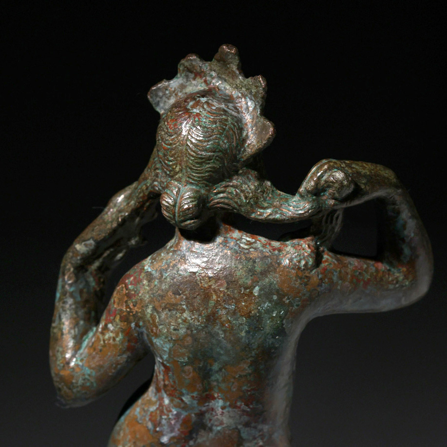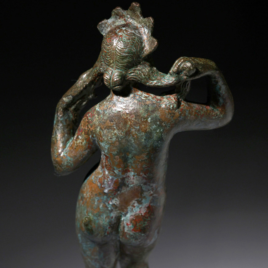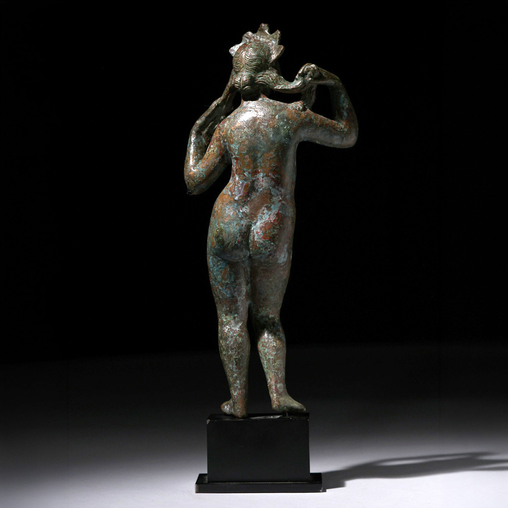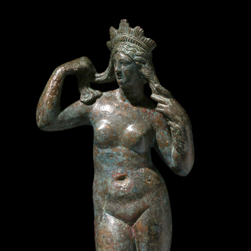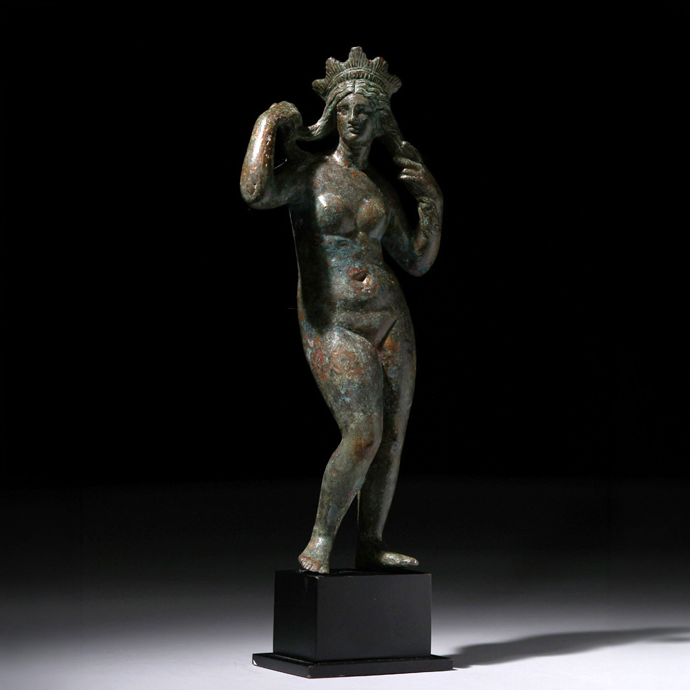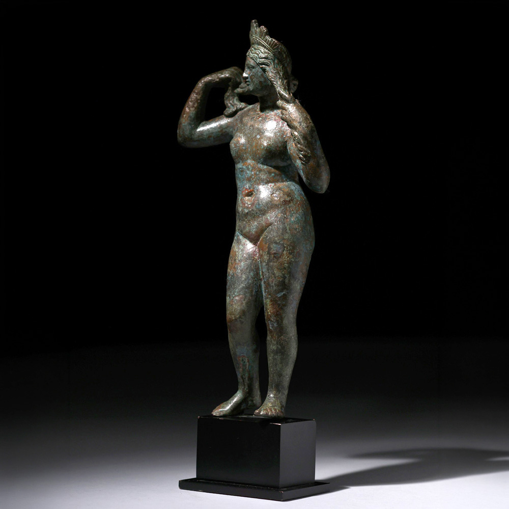 La presente escultura de Venus en bronce, adscrita al Imperio Romano y datada en el siglo II-III d.C., constituye un refinado ejemplo de la tipología de Venus Anadyomene, concretamente en la variante iconográfica de la diosa de pie arreglándose el cabello tras su nacimiento marino. La pieza, de 28 x 12 x 6 cm y 33 cm de altura total contando la peana, responde a un modelo de profunda tradición helenística reinterpretado en clave romana, especialmente difundido en pequeños bronces de carácter doméstico y devocional.