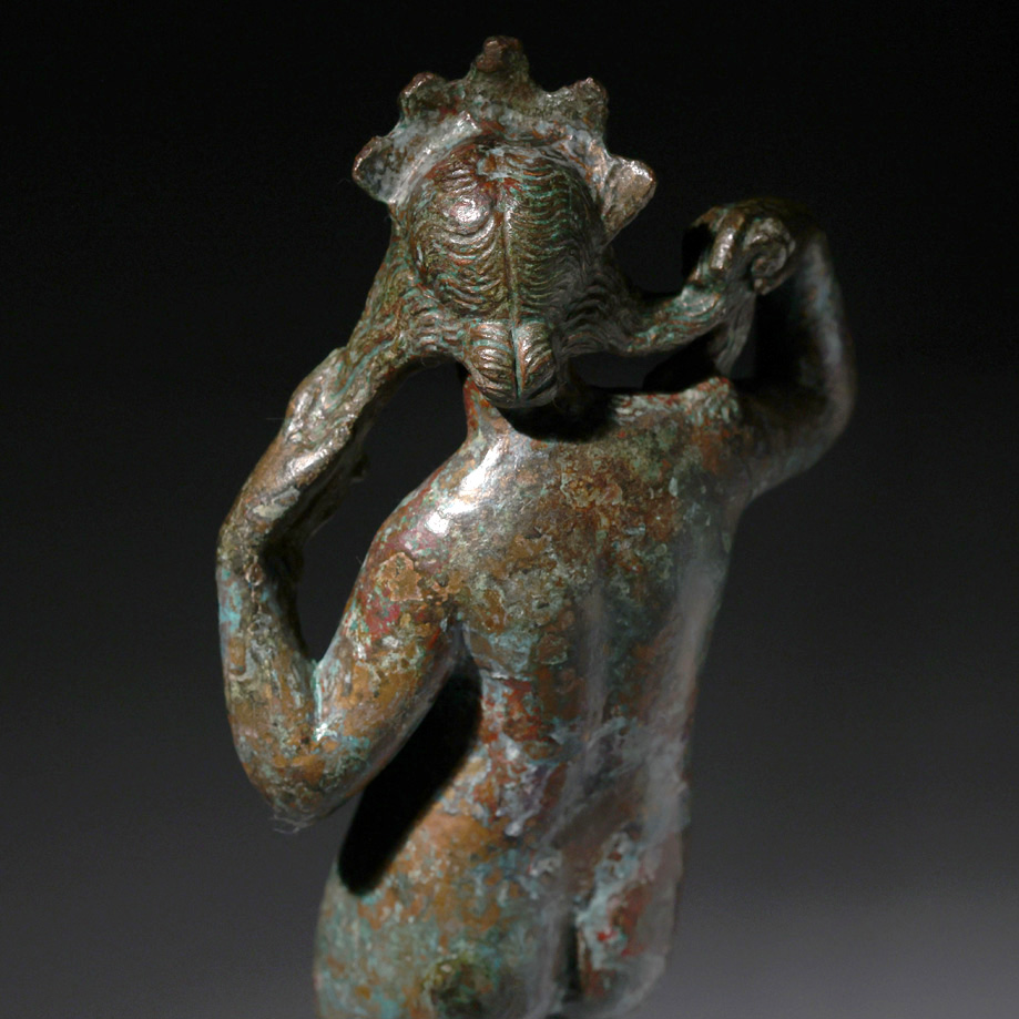 La superficie del bronce conserva una pátina antigua de notable riqueza cromática, con variaciones verdes, ocres y rojizas derivadas de los procesos naturales de oxidación. Estas tonalidades, lejos de restar valor, aportan profundidad visual y autenticidad histórica. La textura irregular del metal evidencia la técnica de fundición a la cera perdida, procedimiento ampliamente empleado en la producción de pequeños bronces romanos, que permitía reproducir modelos escultóricos con gran fidelidad y detalle. La conservación declarada como excelente parece coherente con la integridad estructural observable, aunque siempre es recomendable la verificación técnica mediante análisis metalográficos o estudios de pátina para confirmar ausencia de intervenciones modernas.